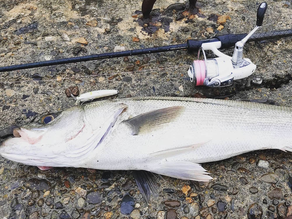 初シーバス行ってきました!とはいえ、違う釣りをしに行ったのですが、天候悪化の為急遽シーバスを狙いに行きました。シーバスのタックルは何もなかったので、同行者に借りて出撃!!落鮎狙って川に入ってる魚を狙いましたが、さほど鮎もおらず何ヶ所か回りましたが不発…最後の最後、河口行ってみようということで、サミング70Fをテロテロ巻いてたらいきなりヌメーーっと重くなり、人生初のシーバスがヒット!!結構あっさり寄ってきたのですが、最後ランディングのとき抵抗され冷っと!同行者にネットインしてもらってなんとかキャッチ!!同行者が持っていたルアーケースにサミングが入ってたことと、ガイドしてくれたことに感謝です!!おもろかったーー!!