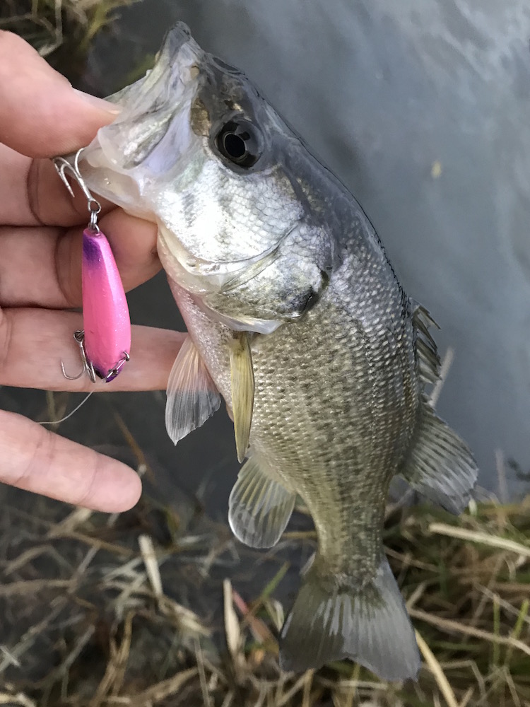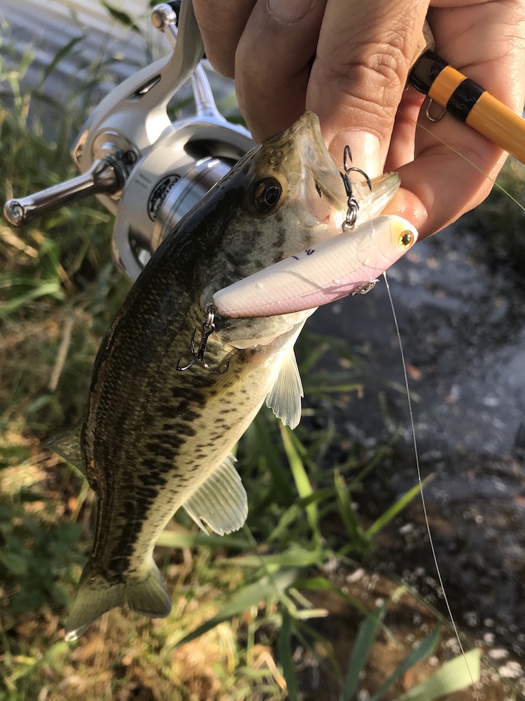 久しぶりの琵琶湖でしたが、ちょっと見ないうちに様変わりしているポイントもありました。水の動きが無かったのかトロロ藻が発生していたり。でもその中をワカサギだろうか?魚種が不明ですが、結構な数群れていたり変な雰囲気。でもそれを狙っているバスっぽい気配は無し。まぁこの日はやりたいことが決まっていたのでその辺りはおいとこう。本日はサムバイブミニ1本で押し通すと決めています。サムバイブミニには2つのウェイトがあり4.5gとSS(3.2g)。僅かな差の様ですが、ライトタックル狙う場合には沈下速度や最適な巻きスピードに差が出ます。水深の浅い野池やエリアで使うにはSS。ソルトや流水域で使うには4.5が基本的にオススメです。因みに今日はターゲットを小バスに絞っての内湖狙いなのでSSがピッタリ。スタッフもルアーに合わせて珍しくスピニングタックルを使用。4.5ならベイトでも使えますが、スピニングは楽だね〜。釣り始めてしばらくして待望の小バスの反応が出だす。しかし、これがなかなかフッキングしない。針が小さくバスも小さいだけに仕方が無いが・・・。SSのリフト&フォールも良く、何度もバスのコンタクト有り。エリアで結果も出ているリフト&フォールは着底姿勢も良くバスでも十分使えます。結果としては2尾しか手に出来なかったけど、今度はフックを替えてフッキング重視のセッティングで狙ってみます。まともなサイズも釣らないとアカンよね〜