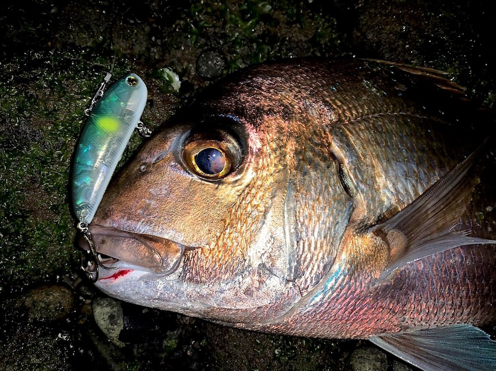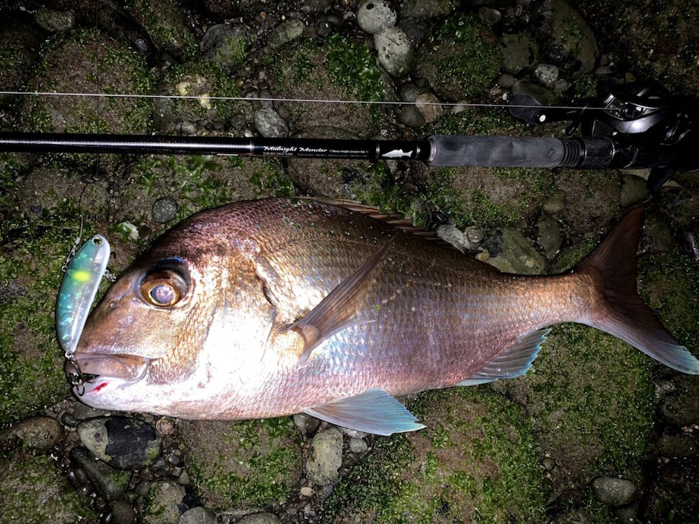 こんにちは。いつもお世話になっております。淡路島のスズキは12月に入ると産卵行動に移るため、釣るのはやや難しくなります。でも、釣れない時こそチャンスがあると考えて毎年ポイントに立っています。いつもの水道で干潮の1時間前から立ちこんでキャストを続けるも、やはり全く音沙汰なしです。干潮を過ぎ、上げ始めて1時間余り。サムバイブ15Gを潮上にフルキャストして5カウント。そのまま竿を立ててサムバイブの頭に潮の流れを当てるようにしてリトリーブではなく潮流でアクションさせるように意識します。前触れなく竿が引き込まれ、ズシリと動かなくなりました。根掛かり?竿を立ててみるとグイグイと生命反応が。スズキではありません。かといって、こんな真っ暗な時間にハマチか?ヒラメならバッタンバッタンするし。どっちにしろ、それらの魚ならルアーを捉えた時にガツンと伝わるはずです。噛みに来るチヌか・・・と思いながら強い引きをしのいで引き寄せると、なんだか赤い。真鯛の50cmでした。鯛類はルアーを吸い込まず噛みつくこともあるのでアタリは小さいのかもしれませんね。