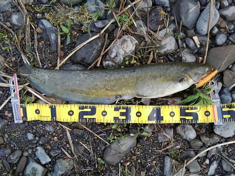 流れのよどんだ岸際のシャローでサミング70Sでガツンとバイトあり、グイグイよく引く55センチのナマさんでした。