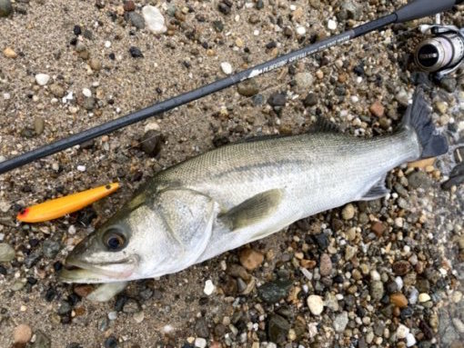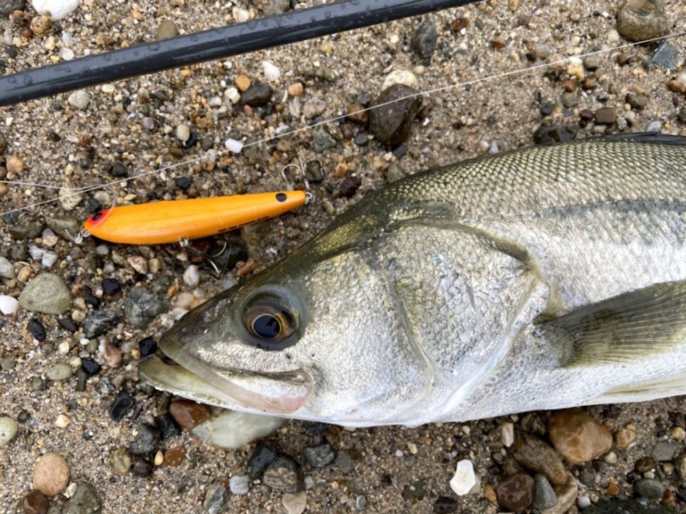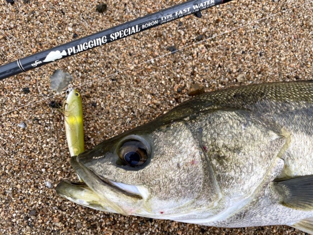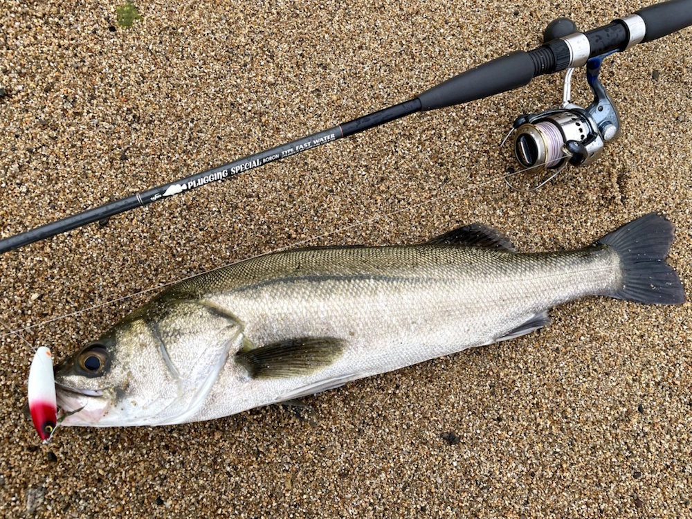 こんにちは。まとまった雨のタイミングで河口サーフへ。漁港のすぐ横の砂浜に流れ込んでいる地形なので、漁港テトラに向かって川の水が流れ出しています。川の水が当たっているテトラの際でボイルを見つけたので、すかさずファットサムをキャスト。着水後、水面が激しく割れます。いきなりヒット、ですがポロッと外れてしまいました。昨日針を交換したばかりなのに。ファットサムで反応がないので、流心をスラローマー85SSSでなぞることにします。今度は沖でヒット。しかし、首振り一発でフックアウト。気を取り直して、再びキャスト。今度はガツンと掛かりました。夏のスズキらしくハイジャンプを繰り返しますが、フックが決まっているので落ち着いて取り込み。まずは65cm。またファットサムに戻して、最初に食ってきたテトラより遠くのテトラ際にキャスト。テトラ際ギリギリに着水。何度か首を振らせてポーズを入れると、激しい水柱。鰓を張ってジャンプをしますが、重々しい動きはそこそこ良型のようです。かなり粘られましたが、取り込んだのは肉厚の夏らしい体色の個体でした。長さは70cmですが、重量のあるコンディションのよい魚でした。その後、別の河口で59cmをファットサムで追加。やはり雨が降れば私でも釣らせてもらえます。釣果は自然の流れに任せるしかないのです。
