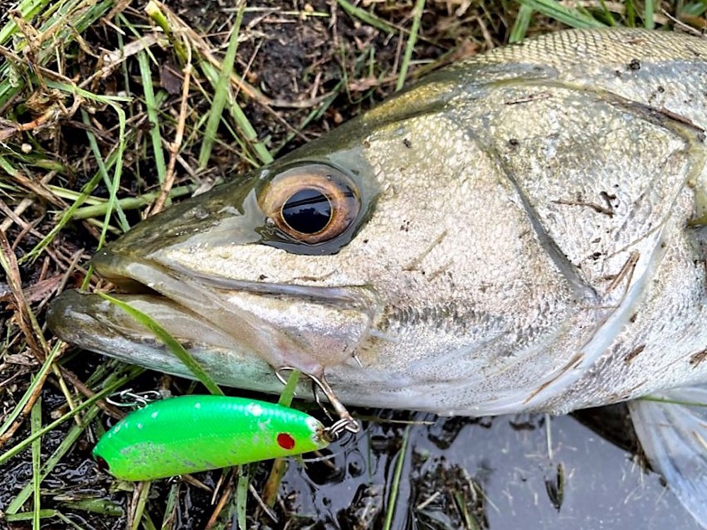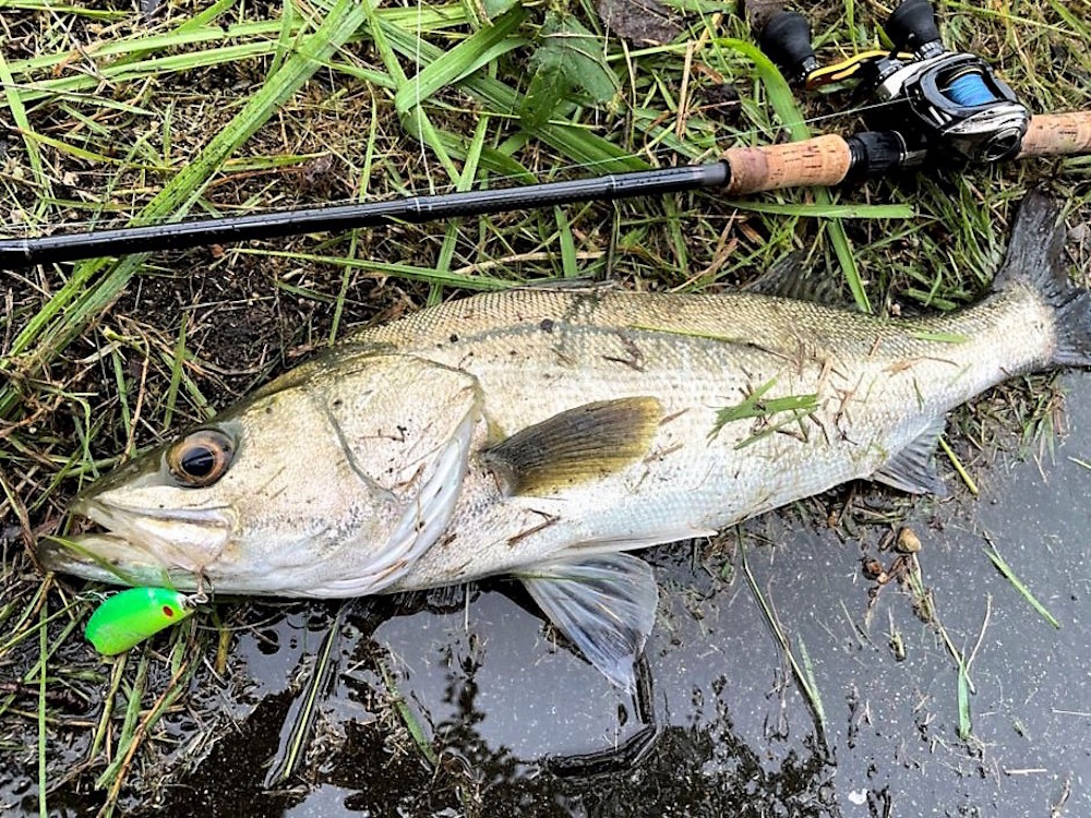 今回も大雨後の釣りです。前回は河口サーフでしたが、サーフが有望なのは基本的に干潮時。河口の流れが海側に餌となる生き物とともに勢いよく吐き出されるからです。しかし、今回のタイミングは満潮です。満潮になると河口の水位より海面の方が高いため、餌が流れ落ちてきません。つまり、時合いを外しています。こんな時は河川の一番突き当たり、つまり堰の下がポイントになります。干潮時はほとんど水位がない地元の河川も満潮時には100cm近く水位が上がります。市街地を流れる河川の堰が有望ですが、このポイントはかなり足場が高く5mの玉網がギリギリ届きません。もし届いても濁流に網を取られてどうしようもなく、ヘビータックルで強引に抜き上げるしかない場所です。その代わり、スズキがルアーに食いつく様子が真上からばっちり見えて結構楽しいです。(※めったにないですが抜き上げられないほどの大型が掛かった場合は、玉網で口に掛かっているルアーの遊んでいるフックに網を引っ掛けて魚を吊り上げてます)サムバイブ13Gを濁流の中に軽くキャスト、巻いてきてピックアップ寸前にサムバイブの真下から激しく突き上げてきました。一旦クラッチを切ってラインを出して仕切り直し、十分抵抗させて体力を削ったところで抜き上げて取り込み。65cmほどですが、すこぶるコンディションのよい個体でした。河川内は痩せた個体が多いのですが、大雨で海から餌を摂りに遡上してきた個体でしょう。