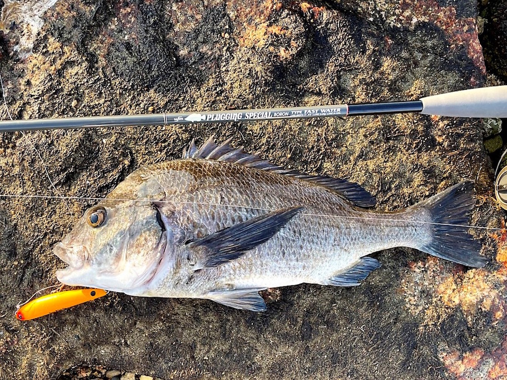 流量も減り水温が上昇して来ると、これまた楽しみなチヌトップゲーム、お年寄りの痩せ気味かも知れませんが46cmです。追尾してくる事が感じられて楽しいでしょうね。ありがとうございました。