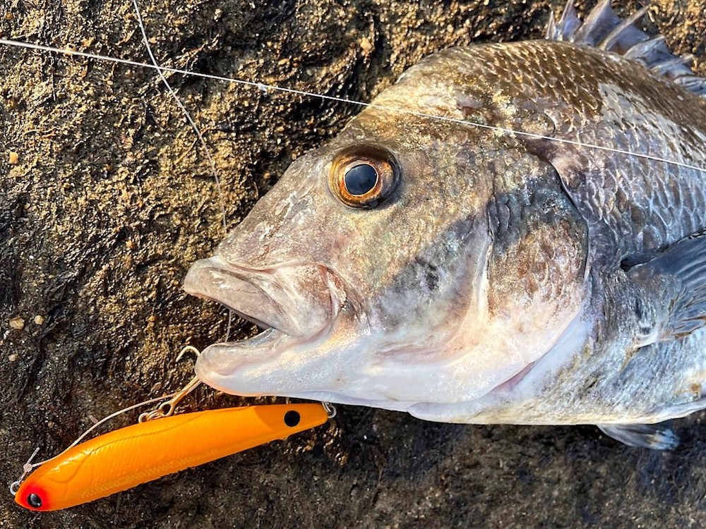 厳しい残暑が戻ってきました。夕方にちょうど干潮を迎える瀬戸内海側の河口でチヌ狙いです。2投目、逆光でファットサムの位置を見失いました。どこかな?と水しぶきを立てるように大きく動かすと、ファットサムの位置が確認できましたが、同時にファットサムの後方がモコモコ盛り上がっていました。次の瞬間ファットサムが引き込まれたので、アワセたらガツンと乗りました。46cm、少し痩せ気味な個体でした。