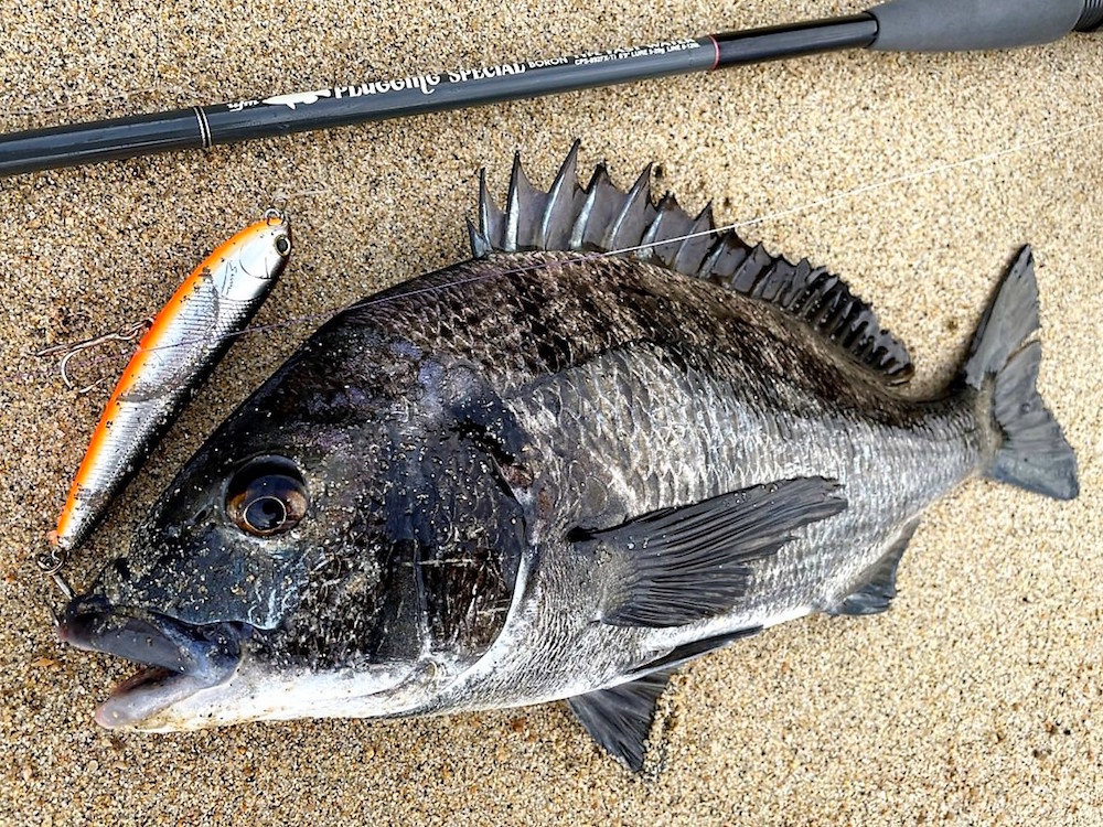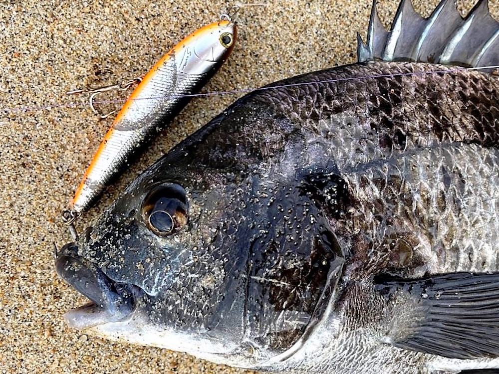 あれだけ大合唱していたクマゼミの声はもう聞かれなくなり、ツクツクボウシが今や主役とばかりにあちこちで鳴いています。このツクツクボウシが発生する期間こそがチヌトップの最も狙いやすい時期ではないかと、10年の経験から考えています。夜明けは青物を狙いましたが、回遊物を狙うのは元々性に合わないので、数回投げて切り上げて場所移動。やっぱりチヌ狙いです。この夏の台風の影響で、数年前に好調だった小磯サーフは砂が堆積して本来沖にあったシモリが地続きになっていました。水中の地形はどうなっているか分かりませんが、チヌが居着くシモリがかなり近くなってしまったので、少し厳しいかもしれません。ファットサムPSを投げながらどんどん移動。海中から突き出たシモリの脇を通過させたときに、ファットサムの真下からフワッと波紋が広がりました。興味を示して近づいてきた個体です。じっと見ています。ただ、こちらから見えるということは、相手もこちらにすぐ気づく距離です。ルアーに注目させるべく小刻みに動かします。突いてきましたが、本気で攻撃する気はなさそう。できるだけその場に留めて縦に動かします。するとしびれを切らしたのか、ようやくテール部分に噛みつきました。引き込んだのを確認してフッキング。40cmと小さい個体でした。
