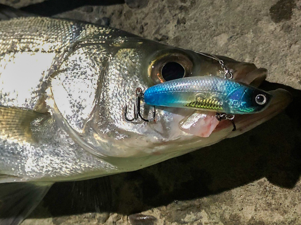 今回、初投稿になります。宜しくお願い致します。浜名湖を拠点に毎年秋〜冬にかけて、ライトソルトゲームをやっています。他のエリアと違う所は汽水湖であり、かつ干満で流れがあること。特に大潮〜中潮では川のような急流が出来てその中でシーバスはベイトを捕食し、ヒイラギ、カタクチイワシ、エビをメーンとしています。2〜3年前はシーバスロッドを使用して他社製品の鉄板バイブレーションを使用していたが、アクションや流し方が単調となり、すぐスレてしまいます。その時あるアングラーと出逢い、ライトタックルを使用して釣っていたのに衝撃を受け、そこからライトタックルでのシーバスを挑むようになりました。今回の釣行では、同行していた方にサムバイブミニ 4.5を勧められたために初めて使用。他社のバイブレーションと違ってエアルームを大きく確保している為か、流れのヨレに自然に送り込むことが可能となって中層でヒラスズキ(フッコサイズ)がヒット。この時のコンディションでは他社バイブレーションでは容易に獲れる1尾ではなかったと思います。今後もサムバイブミニをタックルボックスへ入れ釣行へ行きたいです。