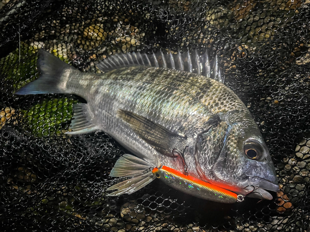 ここ近年は3月になると渓流解禁となり、そちらに注力するため浜名湖の釣りをオフとしてきた。近々のサムルアーズレポートは秋から厳冬期の流れが早いエリアでの釣果で、これはトラウトルアーに通ずるものがあるから続けてきたわけである。そんな私が久しぶりに奥浜名湖エリアの釣りをしようと思い立ったわけであるが、もはや地形はわからない、潮のタイミングも不明、ベイトは何になるのか…浦島太郎状態からのスタートである。しばらくはボウスが続くものと想定していた2釣行目。下げ止まりから上げのタイミングで知人が先行して良い釣果を叩き出した。所用があるため到着が遅れ、私が現着した時にはすでに時遅し状態。とりあえずヒットルアーとカラーを聞き、現在知りうる情報から立ち位置を決めてキャスト。ボイルもない広いオープンエリアで行き着いたのがサミング70SPのスローリトリーブであり、ひったくるように小型チヌがヒットしてくれた。バチ抜けパターンを想定していたのだが、この日はほとんど抜けず。ハクがいたので、このカラーで釣れたのも納得である。まだまだ情報が少なく、ここら辺はもう通って感覚を身につけていくしかない。久しぶりの奥浜名湖でのこの釣果を足がかりに、メカニズムを早く解明していきたいところだ。