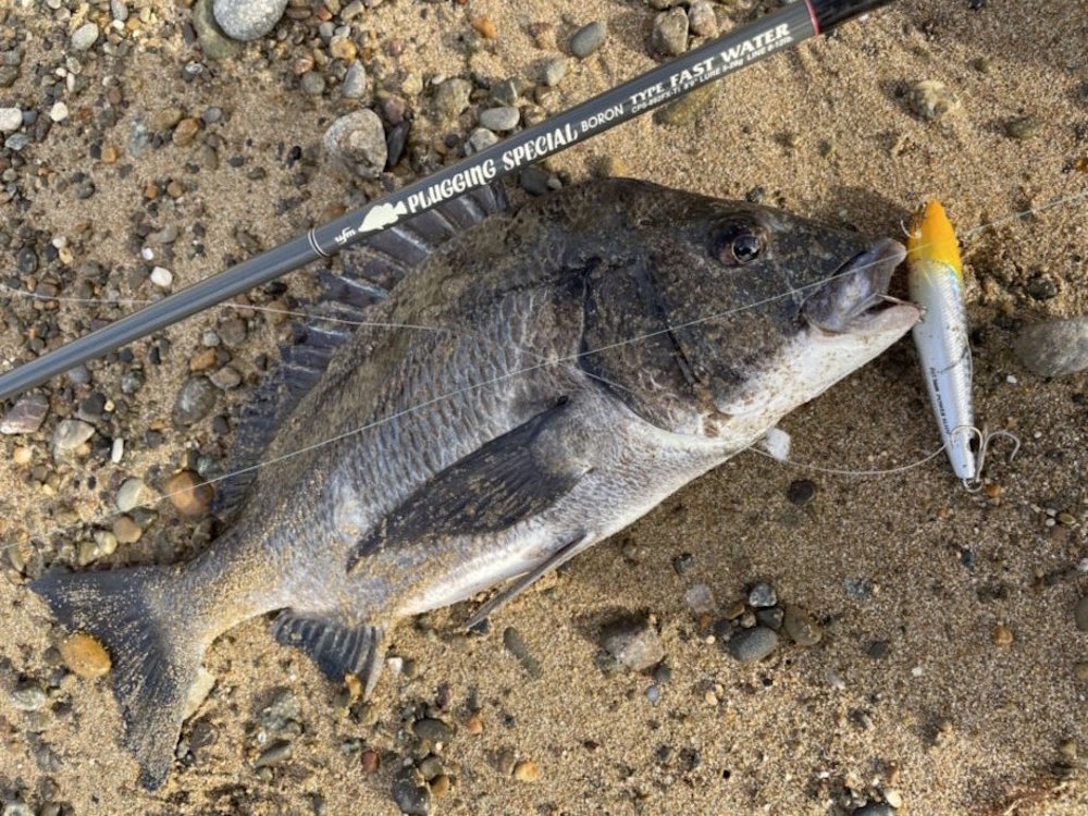 いつもお世話になっております。猛暑とともにハイシーズンを迎えるチヌトップですが、今季もなかなか結果が出せていません。一応、干潮べた凪というのが確率の高い条件だと認識していますが、逆の時でも釣れることがあるので結局条件や時間帯に関係なく竿を出せる時間ができればチャレンジするというスタイルです。何時間も前から場所取りしたり隣の人を気にしたりすることがないので、釣れる確率は低くても私のような者には合っている釣りです。今日は、夕方に干潮を迎えるタイミングで一応確率が高い条件でした。まあ、それでも釣れるかどうかは全く読めません。ファットサムGPを遠投し、砂浜を歩きながら幅広く探っていきます。沖に着水したファットサムをワンアクションさせた時、突如水面が割れてラインが走り出しました。ガッチリと掛かっているようなので、余裕をもって取り込みました。今年初物のサイズは小さめの42cmでした。チヌは、いきなり食わずにしばらくチェイスしてくるので、食ってくるまで間合いを詰めていくのが面白いのですが、今日は珍しい出方でした。