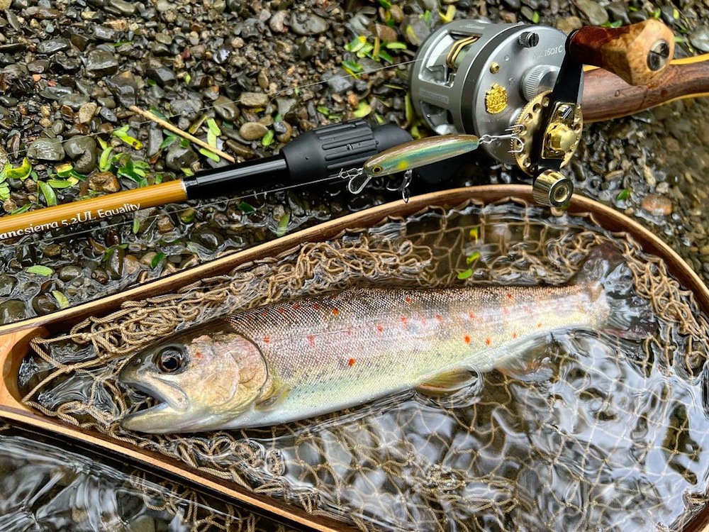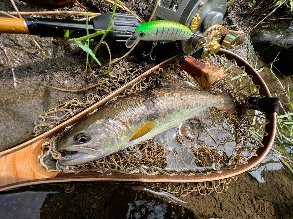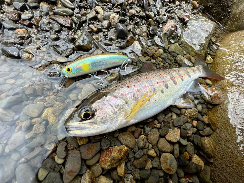 久しぶりのレポートです。最近の天気は回復したと思ったらまたゲリラ豪雨!で、増水の繰り返し…天気予報があてにならないですね。そんな合間を見ての釣行です。この家近くの渓流へ。白濁りはあったが増水はしておらず、入渓ポイントからチェイスが多数。ただバラしも多数…。まだまだ下手っぴです。S45cwのラメモスバックタイガーYBを使ったが反応がイマイチ。レーザーアユに変えた所、一発でフッキング。この時、雨、白濁り、薄暗いの状態。フラッシングを強くした方が反応が良くなった感じです。さらに釣り上がって行くと両側護岸の浅い所があり、suming-50cw(ラメモスバックタイガーYB)をキャスト。強過ぎないアクションを意識した所、泣尺アマゴがヒット!ここのポイントはオープンエリアでかつ天候が晴れに変わったタイミング。ギラツキを抑えたモスバックが有効だったと考えます。カラーセレクトの大切さを感じられた釣行となりました。
