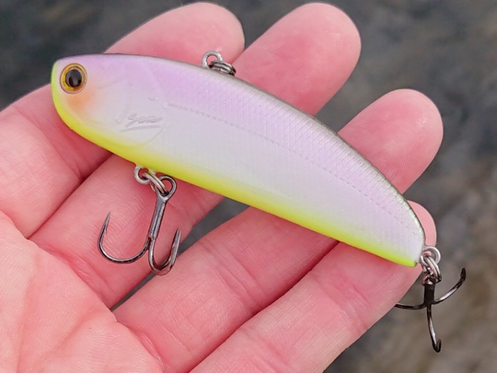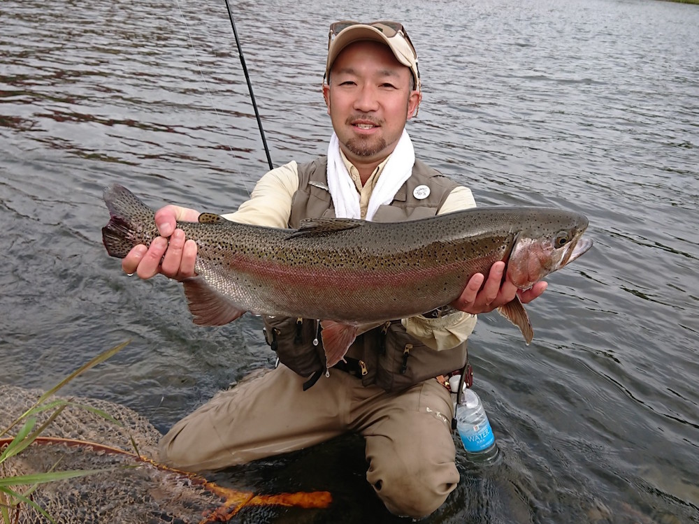 当日はすっかり寝坊をしてしまい、更に途中崖崩れにより通行規制で迂回を余儀なくされ、約1時間半近くロスをしてしまった。現地に着くと鮎釣り師の方々数名が既にポイントに立っていた。時間は取り戻せないのでここは気持ち改め冷静に戦略を考えた。鮎をヒントに使うカラーはこれと決め、空いてるポイントへ入った。(この日の為に購入していた)水量はやや減水気味だが悪く無く、釣れそうな雰囲気が漂っていた。アップ気味にキャストしリフト&フォールを繰り返し、丁度ストラクチャーの付近でルアーが止まった!実はここは前回根がかりしたポイント、今回もヤバい!ヤってしまった!と思った瞬間動き始めた。重量感を感じながら数分間のやり取りの末、無事にネットイン!途端に他の鮎釣り師さん達より拍手を頂いた。人生で最も良いコンディションの虹鱒をサムバイブでキャッチする事が出来ました。sumlures様に感謝です。