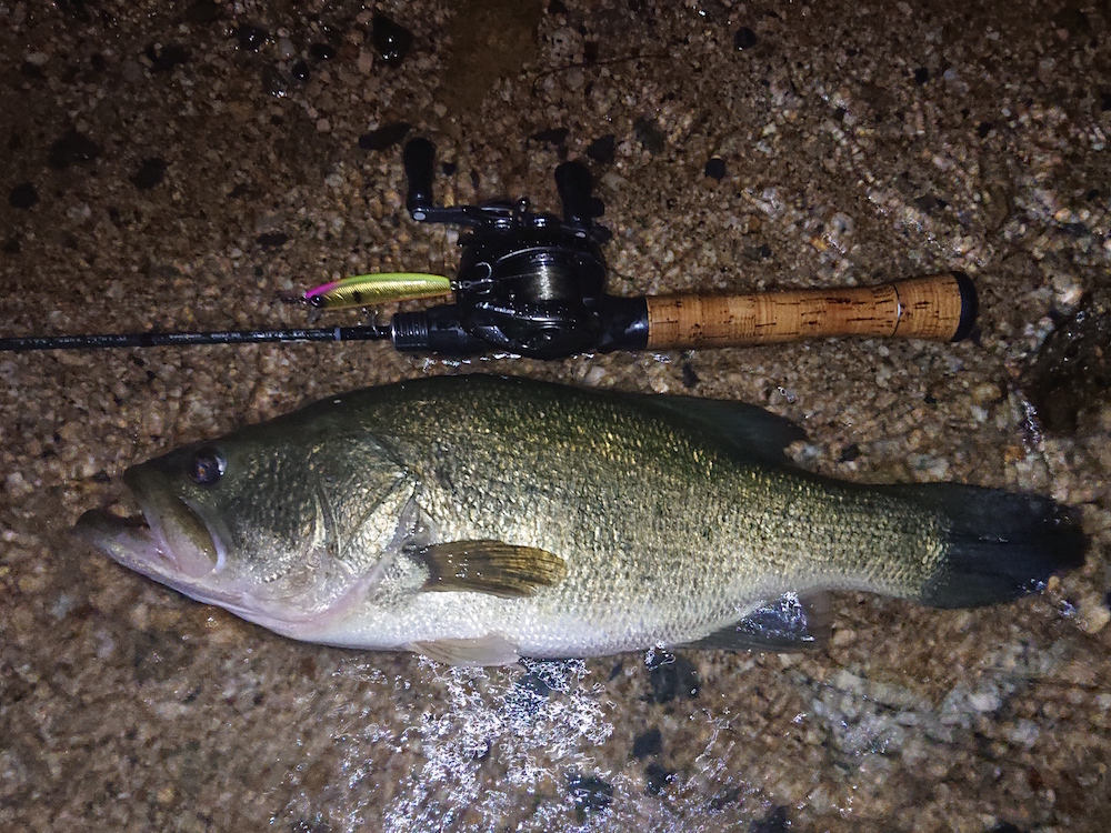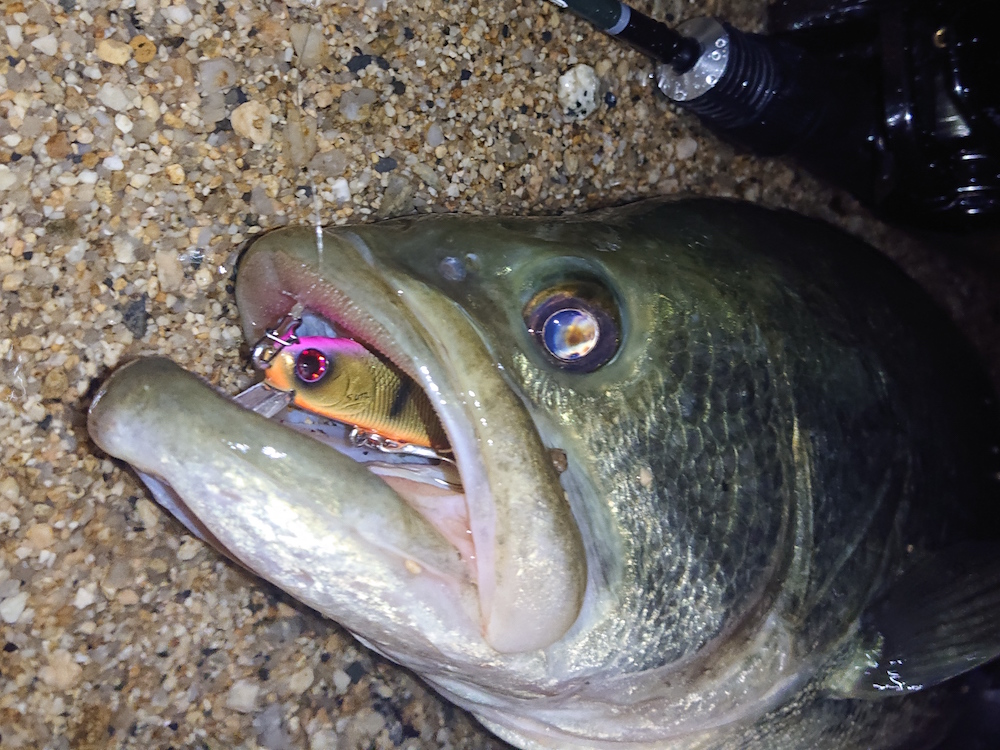 ようやく夜が涼しくなってきたタイミングで雨。 うーん、なんか釣れるかもと思いいつもの浜へ。到着すると先行者が二人。仕方なく少し離れた流れ込みでまずはコトカスミディアムを通すも無反応。リップレスサミングSPで角度を変えながら丁寧に通すも何もなし。ニゴイもおらんのか?と一人ぶつぶつ言いながらキャストを繰り返していると先行者二人が移動するのが見えたのでそそくさと本命ポイントへ移動。叩かれた後なのでそう簡単に反応は得られず雨がきつくなる中誰もいない浜をひたすら歩きながら撃って行くも生命反応無し。いつもならこの時点でびしょびしょの状態で集中力も欠ける状態なのだがこの日はもう一度いつもの大場所に戻ってみようと思い、来た道を戻りながら本命ポイントへ。ここは一番の信頼のサミング70。雨がきつい状況だったので水面よりも底付近で喰わすイメージができていたのでサミング70SPを流れの奥にキャストして流心手前でトゥイッチ。で、止める。するとひったくるようなあたりがあり、すかさずフッキング。かけた瞬間バスだなと確信し、落ち着いてランディング。雨の中、一人よっしゃ~!!と小声で雄叫び。いつもながら納得の釣りができたので夜明けまでがんばる予定でしたが早々に帰路につきました。難しい条件、状況での一匹は本当に感動し、疲れが吹き飛びますね!!また良い釣りができましたら報告させていただきます。