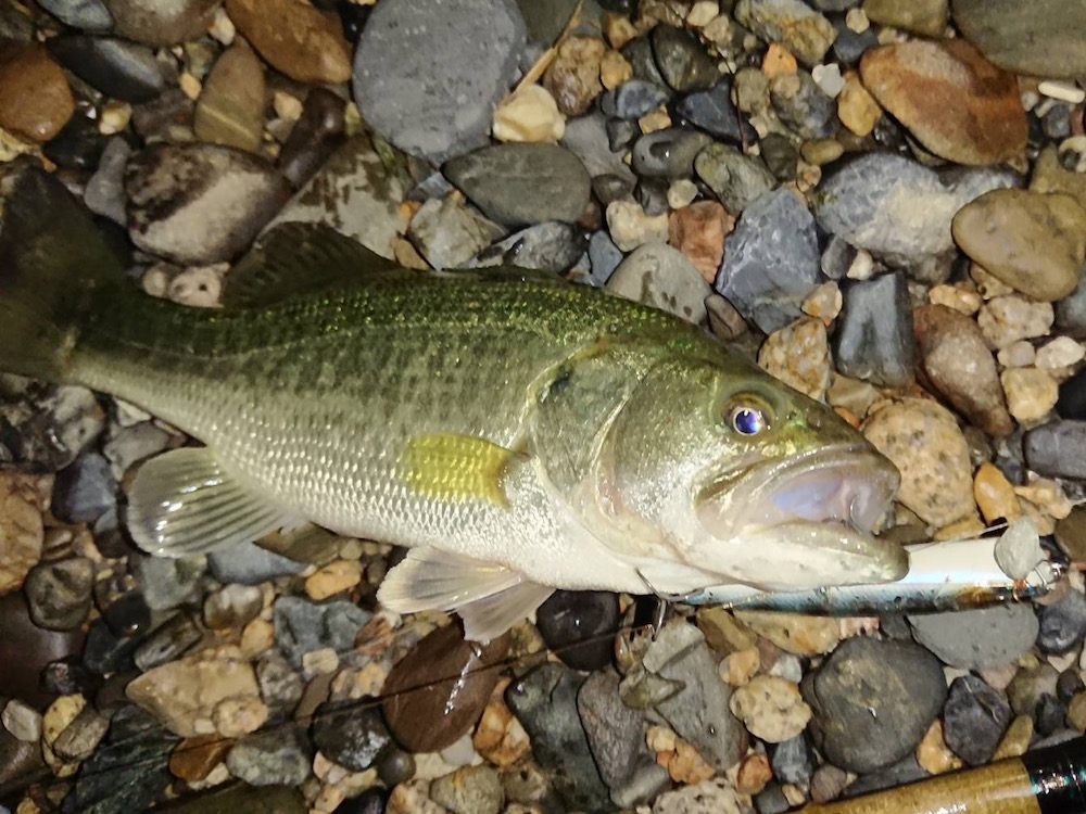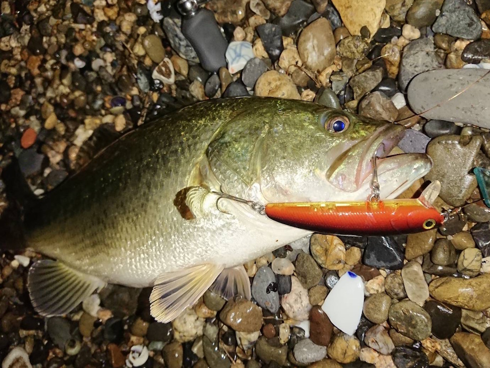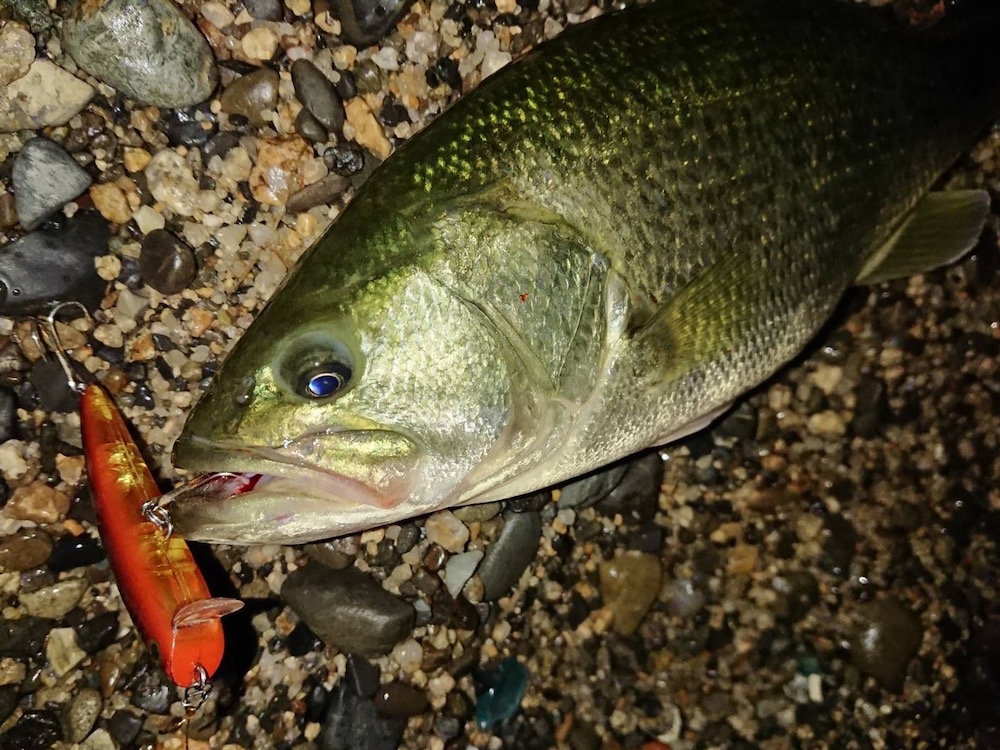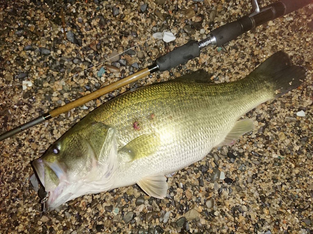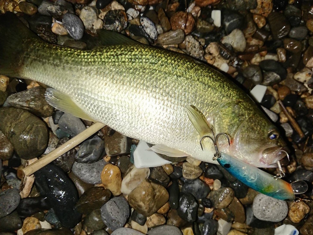 いつも勝手にお世話になります。先週にも琵琶湖に来てましたが訳あって竿は振らず…。釣り初心者二人になんとか初バスを釣ってもらえましたが、その日の条件が悪く思い通りの釣果とは成らず。一人リベンジに。1ヶ所目はハスのみ。2ヶ所目はニゴイ釣りに夢中となり……。あっという間に日付も変わり北上しながら何ヵ所かまわりますが反応無し。で予定より随分遅く本命場所に。コアユは入ってるのは先週確認済み、後は先に叩かれて無ければ…と。いきなり美味しいスポットへコトカスを投入。そろそろ出そうなところでゴボッ!と大きな補食音!!がのりません!デカかったなぁ…と。しばらく場所を休める為南側の浜をコトカスで攻めます。バイトは多いがミスバイトが多発。アメアユカラーから黒赤のシルエットのはっきりした色へ変えるとビンゴ!ミスバイトが減りました。反応が無くなりコトカスプロップを投入。こっちが正解?激しいバイトが出るように!色やプロップ有り無しで差が出て秋のバスは本当に気まぐれです。(以前秋の昼間ワームでの釣りでしたがシルエットとカラー、そしてサイズが合わないと全く駄目で合うと入れ食いを何度も経験してます。((堤防で20人位の釣人のなか一人だけ入れ食いとか))秋は特に顕著と感じます)。夜でも秋は気にした方が良いかと。で十分場所を休め再度本命スポットへ。2投目でコトカスプロップが襲われました!サイズはそれほどですがお腹パンパンの良く引く秋らしいバスでした。明るくなる前に北側の浜も攻めますがこっちの方が魚多くワンキャストワンフィッシュが続きます。明るくなって反応が悪くなり、他の釣人も来られたのでここで終了しました。子バスでしたが秋らしい釣りを堪能出来ました。まだ何処か出掛けて見ます。