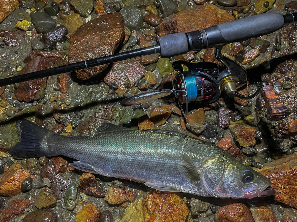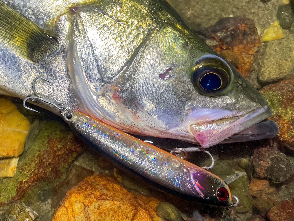 社員AことRYUTA氏、CHOさんとボートゲーム後に再度浜名湖調査開始。1度は本命来ずで不発してしまい、この日は潮のタイミングとポイントの再確認での釣行だ。狙いのタイミングは下げ始め。上げ止まりからエントリーしてその時を待つ。そして下げが始まればウェーディングしてる周辺でボイルが始まる。ベイトはどうやらトウゴロウイワシのようで、ここぞとばかりに水面が賑やか。…しかしいかんせん、サイズが小さい。先日フランクサムでキャッチしたセイゴと同等サイズの群れのようだ。コトカスやサムバイブミニであたるも乗らず、少しサイズが大きい個体も期待できないと見切りをつけて移動。前回私が書いたレポートのポイントに再エントリーして、サムバイブミニSS、4.5で探るも音沙汰なし。どうやらまだゼンメ(ヒイラギ)を捕食してないと考え、サミング70SPに変更。ボイルはないものの、必ず潜んでいるはず。流れの中でジャーク気味にトゥイッチを入れてポーズをとる。魚が少ないであろうから、ナチュラルにヒットへ持ち込むよりもリアクションバイトで拾っていく展開と戦略を立てたわけだ。すると流れの中に出来る、水が止まったスイートスポットに差し掛かって待望のヒット。答えが出てドラグが鳴り、ヨシヨシと思ったところで痛恨のバラし…。貴重な1尾であったために、このバラしは相当応えた。もう今日はボウズかも知れないと頭をよぎったが、タイトにサミング70SPをキャストして攻め込む。かなりギリギリに打ち込んで、着水後即座にワントゥイッチ入れると深いバイトを得られてヒット。魚の動きに合わせてロッドワークを行い、慎重にランディング。写真撮影の際には外に出てしまったが、サミング70SPを頭から喰らいついていた格好であった。1バラししてしまった時に魚の気配もなくて納竿も考えたが、執念で意地を見せた釣果を出せてホッとしたところである。
