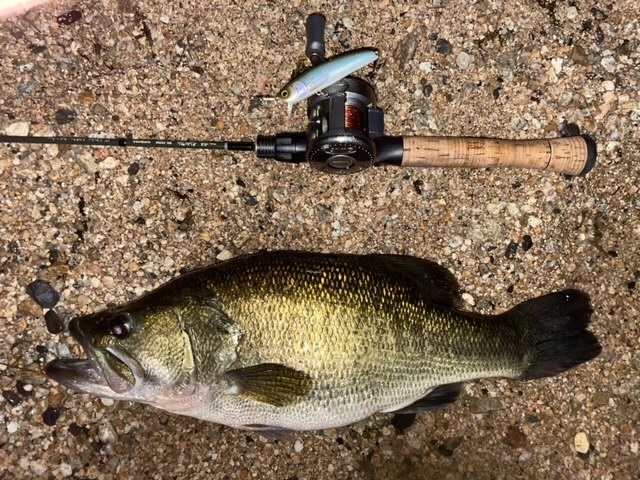 7月に釣行して以来、少し間が空いてしまいましたが、台風も過ぎたりしてめっきり秋めいてきた今日この頃。今回釣行の前日と当日はかなり涼しくなったので、「琵琶湖は夏からどう変化しているかなぁ」と、釣果は期待せずに、とりあえずは様子見がてら出かけてみました。21:00に最初のポイントに到着。まずは表層から攻めるべくコトカスミディアムをキャスト。何投かして魚からの反応が無いので、「ここはダメかな?次のポイントに行ってみよう」と、考えながらコトカスミディアムをキャストしてししばらく放置しておりました。その後ルアーを回収しようとリールを巻くと、何だかグイグイ引っ張られます。「魚⁉︎」と思ったのも束の間、凄く重たくなって全く動かなくなりました。「確かここには障害物は無かったはずだけど、台風で流れ着いた何かが沈んでいたのかな?」と、貴重なコトカスミディアムを開始すぐに無くすのは大変辛いですが、かと言ってこのままだと釣りが再開できないので、仕方なく、色んな方向に回って引っ張ったりしてみましたが、外れる気配は有りません。もうルアーの回収は無理だと観念して、最後に竿とラインを一直線にして、切ろうと力一杯引っ張ったところ、なんと、少しだけズルっと動いたので、更に力任せに引っ張ると、またまたズルズルと少しずつ寄って来るので、「小さな土嚢袋か水の入ったコンビニ袋か分からないけど、とりあえず引っ張り上げてしまえ‼︎」と、リールを無茶苦茶にグリグリ巻きまくって、何とか岸まで引きずり上げました。そうして引き上げられた物体が、暗闇の中、何か『バッタンバッタン』しています。「えっ⁉︎」と思ってヘッドライトを点灯して見てみると、なんと、丸々としたバスでした‼︎どうやら、僕がバスがヒットしたのに気づいていない間に、ウィードの奥深くまで入り込んでしまって“藻ダンゴ”になっていたようです。それを色々と悪戦苦闘している内に、何かの拍子で上手い具合にバスがウィードジャングルから抜けてくれたのか、本当にラッキーな事に、バスを手にすることができました。この様に、今回はバスのアタリも分からず、又、ヒットしてから岸に上げるまで魚だとは思っていなかったので、『自分で釣った』とは到底言えない、本当にお恥ずかしい話ですが、どうかお許し願います。この時点で時間はまだ21:30。ここで満足して帰れば良かったものを…「久しぶりの琵琶湖だから、もう少し様子を見てから帰ろう」と、気づけば翌朝の4:00まで釣り続けてしまい、追加の釣果としては、チャンクSSRにハスと、サミング70SP改(リップが折れたものをリップレスサミングとして再利用しているもの)で小バスを追加しただけで、またしてもフラフラで帰路につきました。良い魚が釣れた時は粘らずにすぐに帰るのが1番だとは頭では理解しているのですが、琵琶湖に来ると、やっぱり時間と体力の許す限り、まさに『寝食を忘れて』釣りという最高に楽しい遊びに夢中になる僕なのでした。
