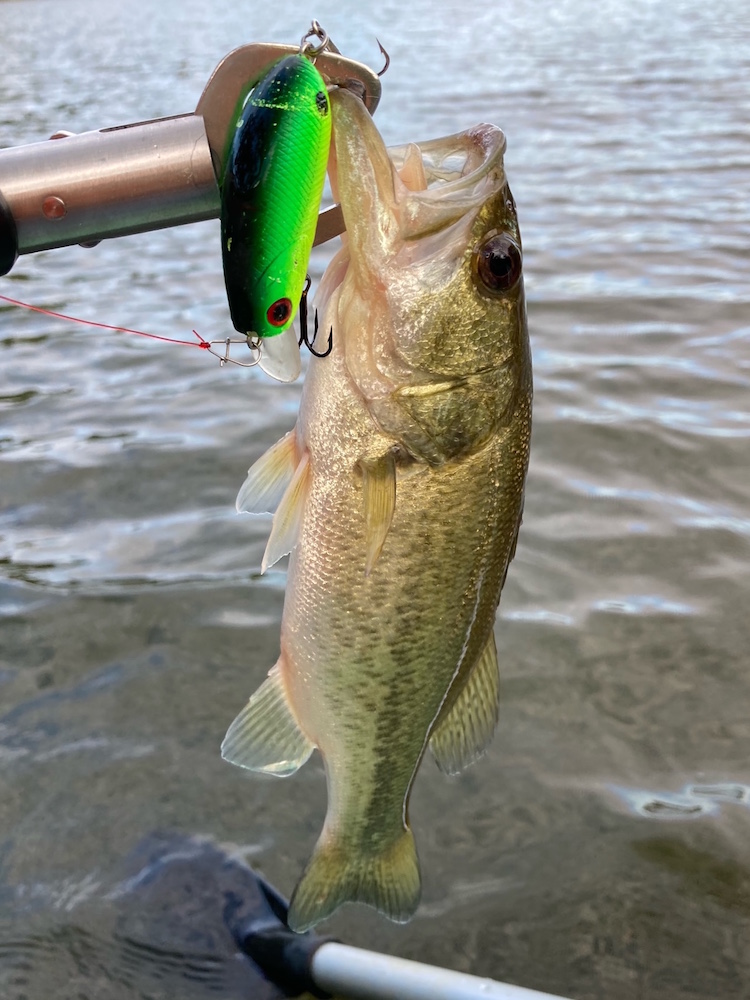 いつもお世話になっています。連休最終日に釣りに行くのは久しぶりでしかも行楽シーズンに行くのは自分の中では考えられない選択です。仕事の都合上日曜日が休みになる事が多くなりスルーしようと思いましたが、天気と風予報を見て出撃しました。落ち鮎も気になっていたので、明け方前の暗いうちから浜に立ちました。弱風に少しに波があり雰囲気は良かったのですが、結果としてコトカスミディアム・クラシックRHでハス1匹とニゴイ1匹で夜が明けたので浜の部は終了します。内湖に移動しましたが、連休なのにほぼ貸切でした。それでも陸っぱりの方が延べ6人なので、ボート組にはほぼ影響ありませんでした。開始早々に小バスをチャンクでゲットしたので気が楽です。しかしその後がまったく続かずノーバイトでほぼ一周した最後のポイントでデカ鯉のチェイスがありましたが、間一髪回避しました。もう辞めようといつも投げないピンスポットにチャンクを通すとコンと小さな当たりがあり、合わせるとライトトリップ52ULがバットから綺麗な弧を描きます。先程の鯉かなと落胆しましたが、ボート近くでジャンプしたのはナイスサイズのバスでした。そこからはギアを本気モードに切り替え難なくキャッチしました。ブッシュに突っ込みながらでしたが、そこはライトトリップ余裕の取り回しでした。久しぶりのナイスサイズに満足しての納竿です。帰りは流石に行楽シーズン最終日ですね、しっかり渋滞で疲れました。ありがとうございました。
