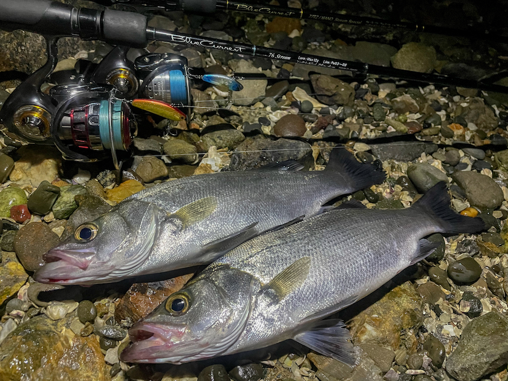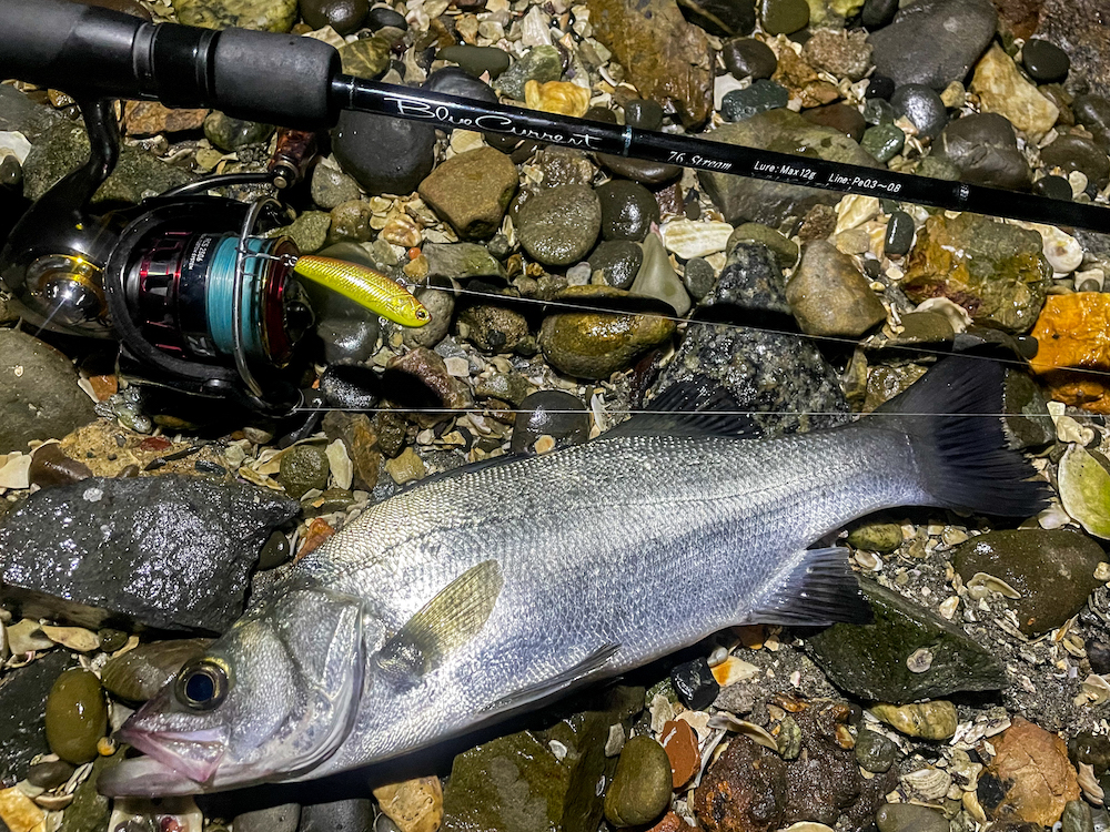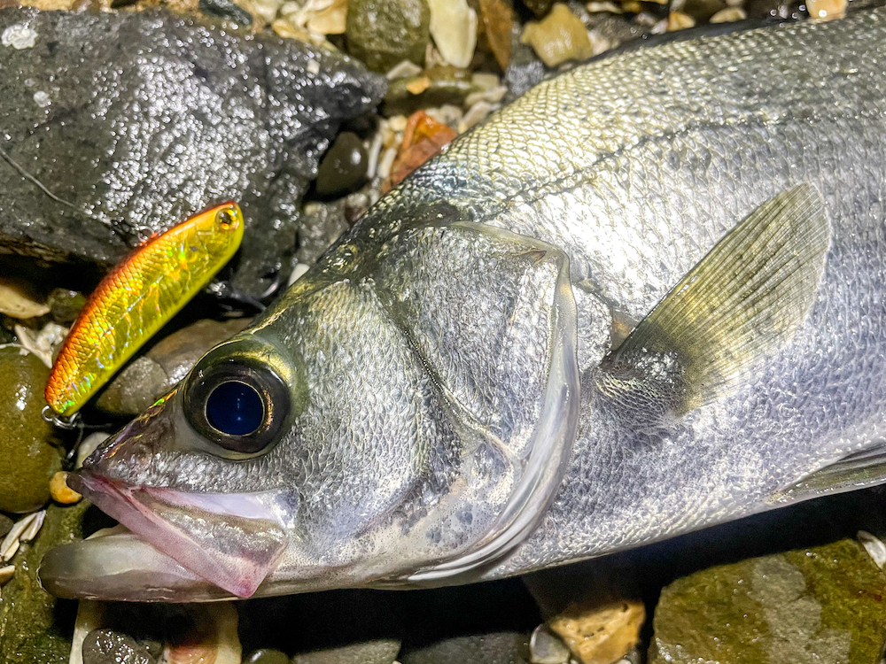 今回はいつハイシーズンになるか気になるポイントへ。10/18は完全不発で魚っ気全くなしで終わったが、現着してみると良いサイズがボイルしていた。コレは!と意気込んでサムバイブミニSSのカラーローテーションで探るもなかなかヒットに至らず…。そしてようやくアタリが出たと思ったら乗らずで回収中に別の個体がリアクションでヒット。そんなヒットの仕方なのでやはりバレてしまった。バレたあたりでHoriuchi氏と合流。2人でサムバイブミニ4.5/SSやサミング70SP、コトカス、プロップドロップブレード、リップレスサミング70Sスラローマー、スラローマー85などありとあらゆるモノを試した。最後はフランクサムまで投げるも音沙汰なし。そうこうしている内に魚が抜けてしまった…。このポイントに見切りをつけて、次に切り替え。するとHoriuchi氏のサムバイブミニ4.5 氷魚にようやくヒット。流れが弱くなってきたものの、やはりヨレの中に潜んでいたようだ。「ここ、撃ってみる?」とポイントを譲ってくれたが、個体数がそんなにおらずでその1尾で場荒れしたように感じたので、他のポイントを探ることに。サムバイブミニで広範囲にいろんなポイントをランガンするも、やはりアタリなし。しかしボイルが出ている場所を見つけ、そこに移動しようと足を運ぶとタッチの差でライトゲーマーに入られてしまった。仕方なくHoriuchi氏のポイントを再度探ることに。氷魚でのヒットであるが、すでに荒れてることを想定。確実にモノにするため、強めカラーのアカキンYBをチョイス。とにかく流して流して、サムバイブミニ4.5をしっかりと魅せつける。1尾出るか出ないか、ボウズを覚悟したところで良いアタリ!しっかりと丸呑み状態で食いついてくれて、無事にランディングできた。序盤の好条件で獲れなかったのは今後の課題となった。カラーなのか、シルエットなのか、レンジなのか…手応えがなかったので再チャレンジしてしっかりと解明したいところである。