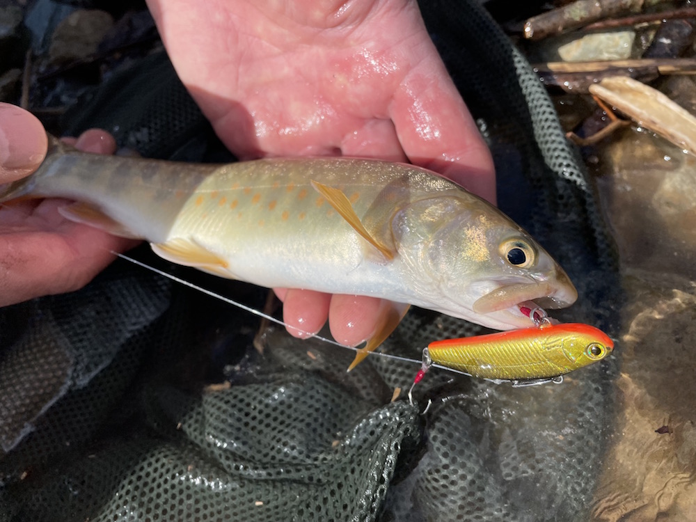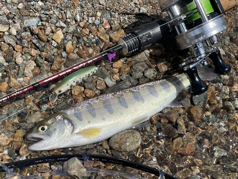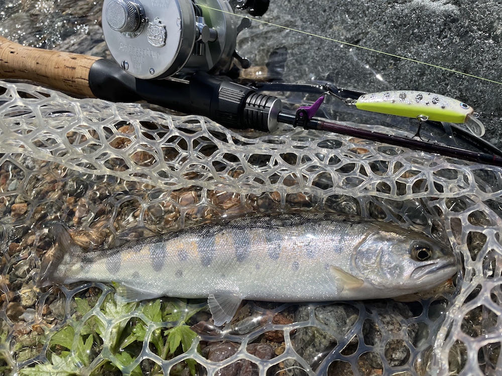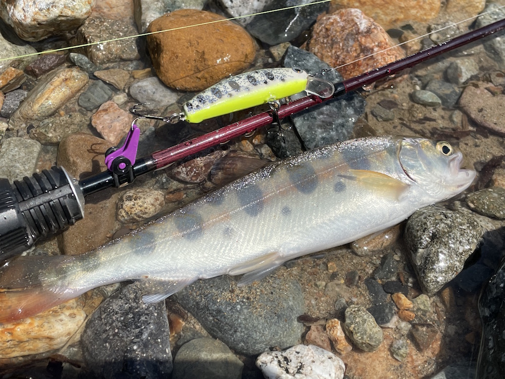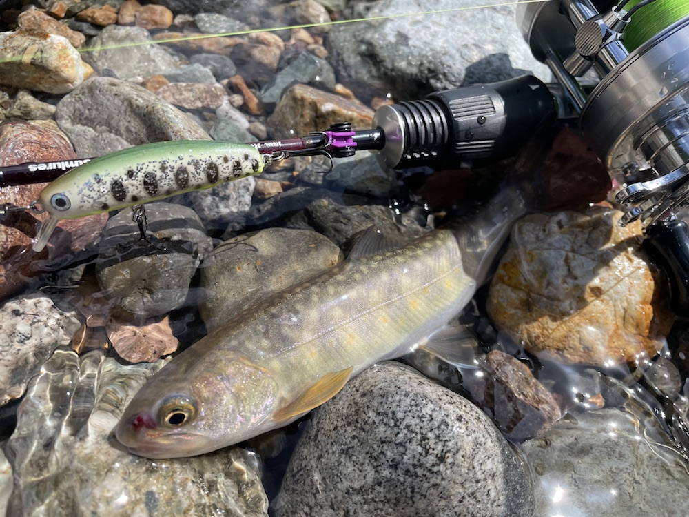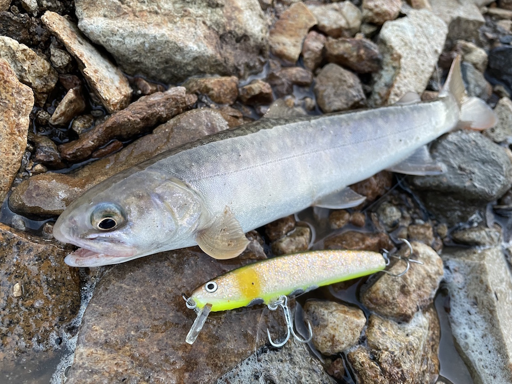 すみません、更新が遅くなってしまい。ダム撃ちリベンジに行ってたんですよね、実は。今回は竿の数を増す意味も含めて古参ユーザーkanemaさんにもご同行頂く。それにしても二週間時が進むとここまで夜明けが早くなるのか・・・三人して完全に出遅れた感有り。既にめぼしいポイントには先行者の車有り。でも、前回sadda氏が2フィッシュのポイントは穴場です、誰もおりません。冷たい北風と小雨が身に染みるも雰囲気は悪くない。しかし魚からの反応は無い。粘って撃ち続けてsadda氏がシラメ1フィッシュ、kanema氏イワナ1フィッシュ、私1バイト(多分大物に違いない!?)。実はここのところ釣果が思わしくない状況だった様だ。原因は貯水量の増加?ぐらいしか思いつかないが、まぁ5メートルくらい?もうちょっと増えたのかな?基本はワカサギの動きに影響される魚達なので、その群れが手の届かないところを回遊しているんでしょう。昼頃に一旦見切りを付けて前回と同様の本流釣りに。流石に前回程に反応は良くなかったものの、2時間弱でそこそこ魚の反応を楽しめるのは癒やされます。アユシーズンの前や禁漁前にはもっと面白い釣りが出来そうではある。さて、3時を回ったくらいで起死回生の一発を狙って再びダム撃ちへと。開始早々sadda氏のサミング70に40センチクラスのチェイス。その後またまたsadda氏が掛けるも手前でポロリ。暮れ方近付き波風あって調子上がってきたか?とそこへ多忙のバイト。ギンギン光って暴れているが強引に抜き挙げ!って空中での姿はどうもお口が小さめ。彼ですがな・・・銀ピカウグイ。続けてまたも銀ピカウグイ。あ、これも噂通りでした・・・ウグイばっかり!と聞いてました。いよいよフィールドも暗くなりルアーの目視も難しくなってきた。そこで奥の手として投入したのがサム山岡ハンドメイドF8.5。トゥイッチダートの艶めかしい事!スタンプ密集地帯で踊らせていると、後に小さな影。ポーズをくれてやるとパックリ。極小でしたがイワナちゃん。いや〜一等地にこのサイズって事は大なのはお留守やね〜次頑張ります!