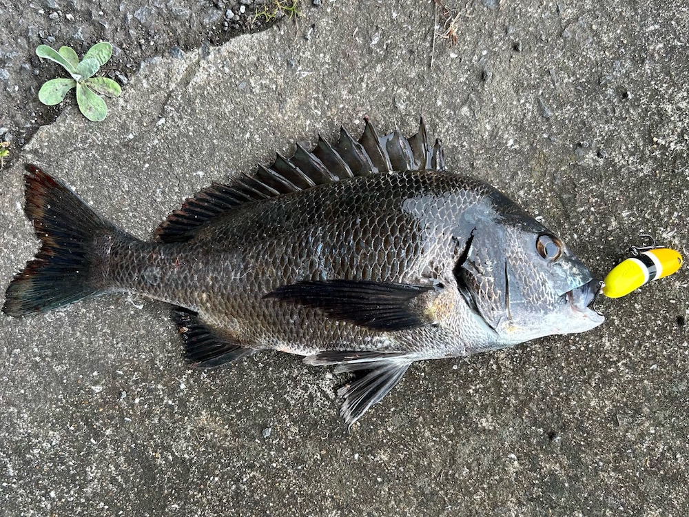 ダツのバイトが異常に多い、とある河口部から対岸の河口部へと釣り場を移動した初日。中〜小型の見えチヌも多少見える中、川を横断する高速道路、高架下の橋脚のキワが駆け上がりから浅瀬に差しているラインをフランクサムのノンストップで軽めのドッグウォークを5メートル程引いた所でいきなり、後方斜め下からのバイトで、今年、最初のトップチヌでの釣果ありです。サイズは25㎝位で直ぐにリリース、その後も誘いの止めは入れずにドッグウォークの速さを変えて探りながら2匹のチヌを追加、合計3匹の釣果でした。潮止まりの状況でしたが、まだ、釣り人も余りトップでのシーズンインしていないのか、プレッシャーが少なかったのか、フランクサムオンリーで楽しませて頂きました。フランクサム、飛距離も申し分無いですし、竿の角度と巻きスピードで軽めのダイブや水面を滑る様にコチラに向かって来る様は操作していて楽しいですね。思っていたより浮力も高いですし、ただ巻きで夜のマルスズキも行けそうで、多少の波にも強めに引けばアピール力も負けませんしソルト用のトップルアーとは違った感覚があり、新たな手札誕生となりました。