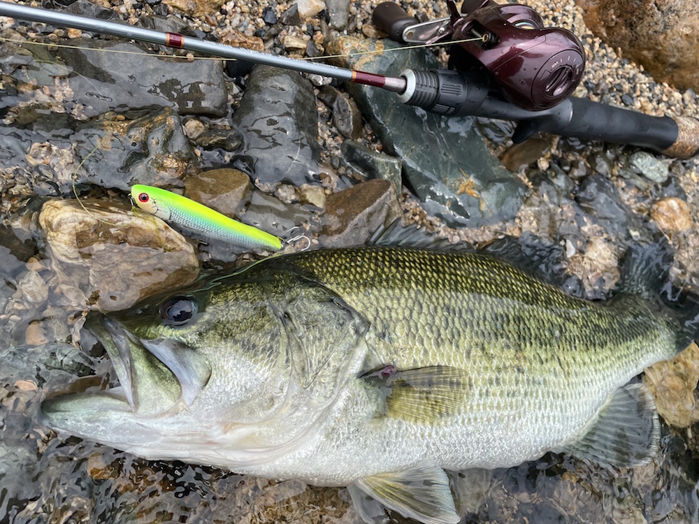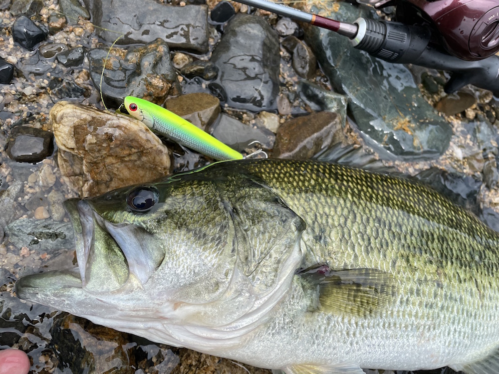 近年はこの時期でも簡単には魚に触れる事が出来なくなってきました。そんな中でも諦めずにフィールドへ向かわねば、次が何年後になるか分かりませんよ!と自分を追い込み奮い立たせての琵琶湖。1ヶ所目はウィードが頭を出し始めており雰囲気抜群ですが、ちょっとゴミが多め。これが原因なのか魚の動きが全く無く、小さなアユボールがウィードに突っ込んでも全く補食の気配無し。ほぼ間違いなくバスは居ないじゃないかな?移動したポイントは流石に水通しが良い様で生命感が目視可能レベル。でもニゴイ、ハス、ブルーギル、コアユときてバスの影はというと小バスも居ない。良くないな〜この感じ。天気も晴れ間が出てきたり無風だったりと、気持ちも盛り上がりません。がしかし、移動を繰り返しながら沖へ撃ち込み続けると、凪の水面を結構派手に割ってくれました。出方からして直ぐにバスだと分かるほど。久しぶりのバスとのご対面で取り込みも緊張しますやん!右側面に網の傷らしきが有りましたが、綺麗で筋肉質の良く引く魚でした。この一尾でかなり満足。その後雲行きも怪しくなり、南西方向からの荒れ気味の波風。南西の風で白波立ってるの珍しいです。湖西を見ながらの帰路でしたが、車を止めれる場所は益々減ってきた印象ですね。