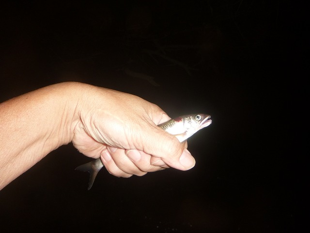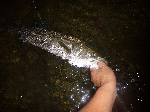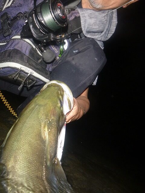 北関東のジェロです。いや~秋も暑かったですね。浸かっていても温泉みたくてアタシがサカナだったらこんなトコやだなと思うほどでした。ここへきて気温も水温も下がってきたので期待が上がる。スリットのある岩盤帯の瀬。踝から膝の水深だからリップカットしたサミングでも底を拾っていつ根がかりするか気が気でない。と何かがヒット。落ち鮎が背がかりできた。俄然テンション上がるアタシ。瀬尻でシュボッ吸い込み音。よし三拍子(ベイト、サカナ、良いルアー)揃ったとファットサム投入。瀬を横にひいていると夜目にも分かる水柱が立った。バーブレスのシングルフックなので鰓洗いはさせたくない。ロッドでいなしてハンドランディング。水から上げずチャッチャト写真撮ってリリース。絵にかいたようないい釣りできた。気をよくして翌晩も出撃してサカナはバラすは、川中で転倒して全身ずぶ濡れになるは、文字通り撃沈したのはここだけの話に。
