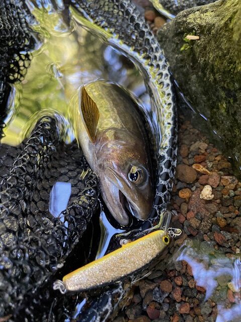 本当に便利な世の中になったものだ。国土地理院の地図を読みスマートフォンのGPSアプリにファインディングしたルートを入力する。もう40年以上前になるだろうか。その時その沢にはイワナが湧くほど居た。本日の狙いは昨今ブームのヤマトイワナ。いわゆる在来種だ。入渓場所から目的の沢までは地図上約2km。あくまで地図上だ。GPSをオンにし山道を進む。地図上存在する山道も予想通り崩落により所々道が途切れている。紆余曲折の後、ようやく沢に到達する。早速釣り始めるが真っ昼間ということもあり反応は皆無。数百メートル釣り上がりやっとチェイス。見えた魚体は間違えなくヤマトだ。すると水音が大きくなる。左上に目線をやると何と滝。20mはあるだろうか。ちなみに地図には未記載だがGPSアプリを見ると等高線が沢を横切っている。これはルートファインディングのミスだ。諦めて引き返そうとすると左岸に高巻きが出来そうなルートを発見する。覚悟を決めてよじ登ると意外にも容易に滝を越えられた。そしてここから魚影が急に濃くなる。チェイスはあるがネイティブだけあってかなりセンシティブ。なかなかバイトに至らない。アップにて狭いスポットをファストリトリーブで流すとようやくバイト。焦る気持ちを抑えて慎重にキャッチした魚は美しい在来種。その後さらに支流へ入り2匹追加。恐らくこれは時合い。もう少し時間が遅ければ下流部でもキャッチできたであろう。本日の目的は達成できたし退渓にも時間がかかるので今日はこれにて終了。まだ上流域もあるので次回の楽しみにしておこう。放流事業が活発化する近年、やはり在来種オンリーの沢は稀有な存在で非常に貴重だ。自分の印象としてヤマトイワナはラスト5kmがキーだ。そしてそのラスト5kmには道無き道もあり走破に少なくとも1時間以上を要する。もちろんそこは熊等動物の行動領域範囲内になる。ご挑戦の際は熊鈴はもちろんカウンターアソールト等の装備、そしてGPSは必須です。万全の装備の上トライして下さい。そこでしか会えない魚とそこでしか見れない美しい風景がきっとあります。