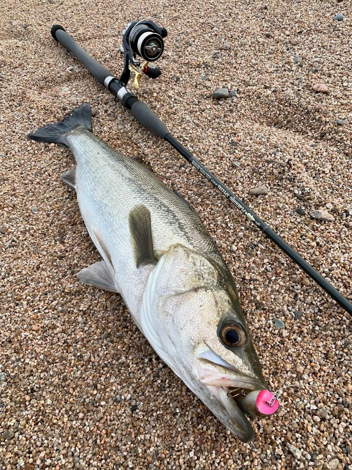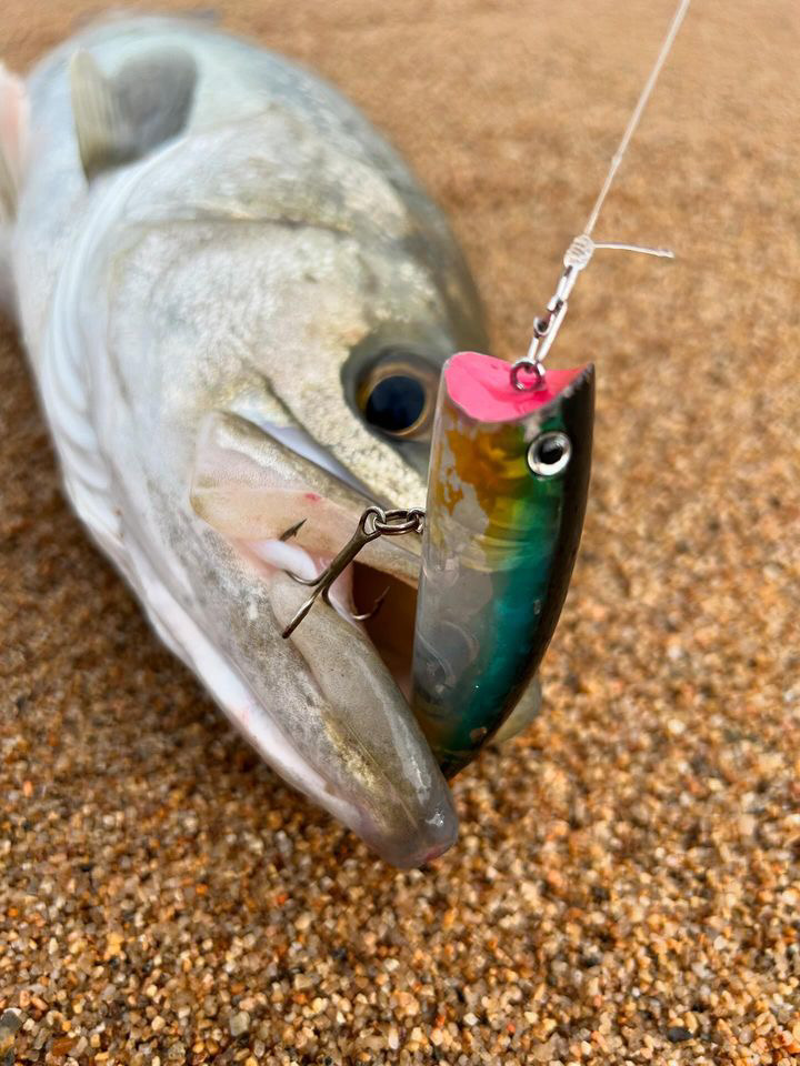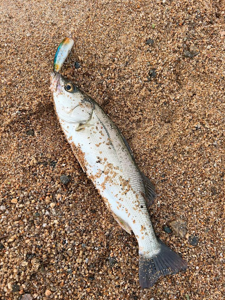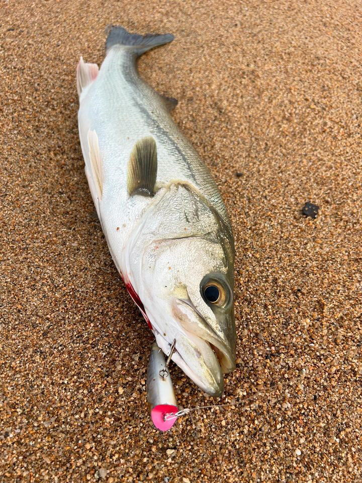朝方に結構激しい雨が降ったので、夕方のタイミングでサーフの流れ込みを狙いました。濁った水がまあまあの勢いで海に落ちているので、居れば反応はあるでしょう。ということで、サムポッパーを選択。流れの抵抗を受けながらボコンと音を出させます。スピニングロッドでのポッパーはラインスラックの処理がちょい難しくて苦手なのですが、流れがあればずいぶんと楽になります。すると、いきなり水面が割れて次の瞬間に頭を振りながら水面を暴れ回ります。フックが決まっていた感触があったので慌てず取り込みました。サイズは60センチ、とまたまた小型ですがコンディションもよく、元気な個体でした。次のキャストでまたヒット、30センチほどの超小型。さらに50センチちょいのを追加。もっといけるかと思いましたが、この数十分の間に潮位が上がってしまったのか、魚の反応もなくなりました。