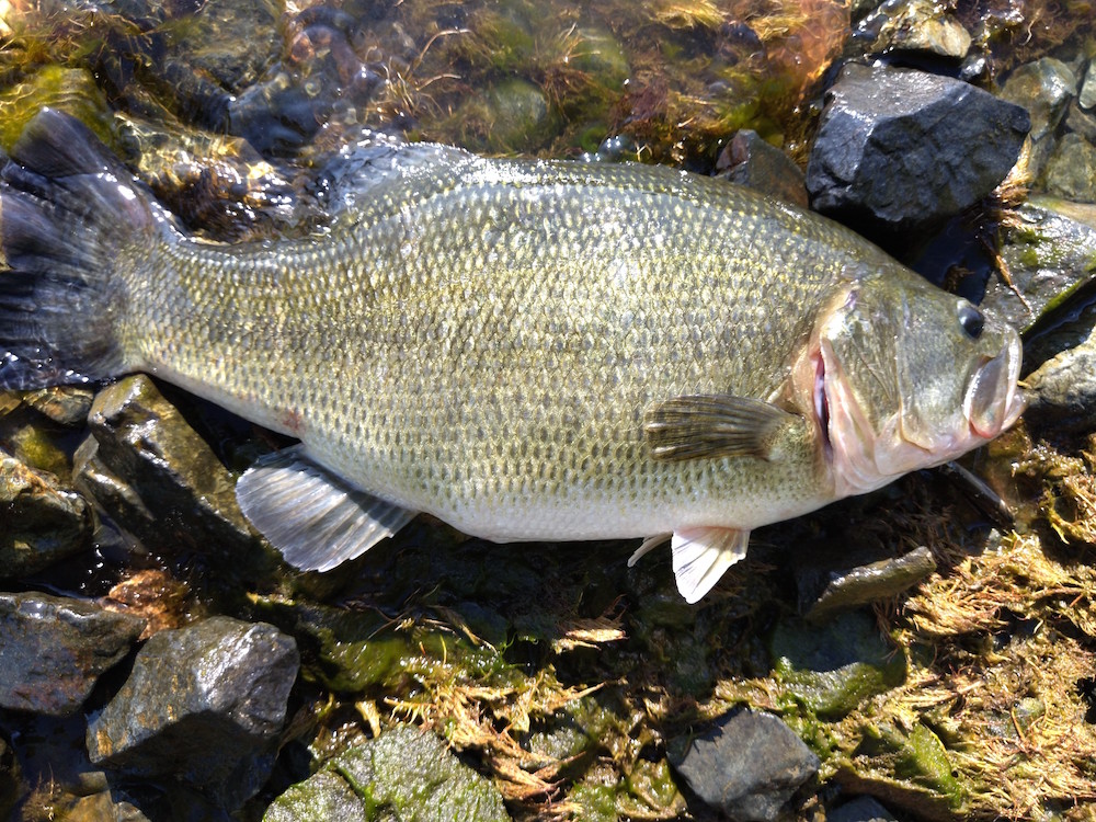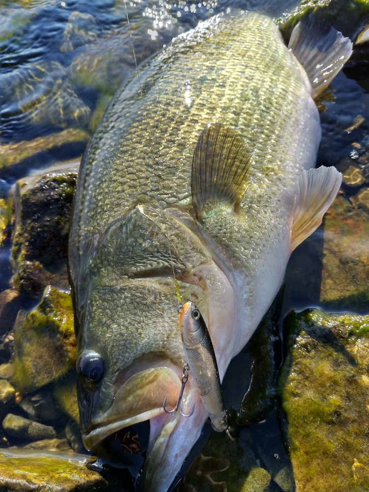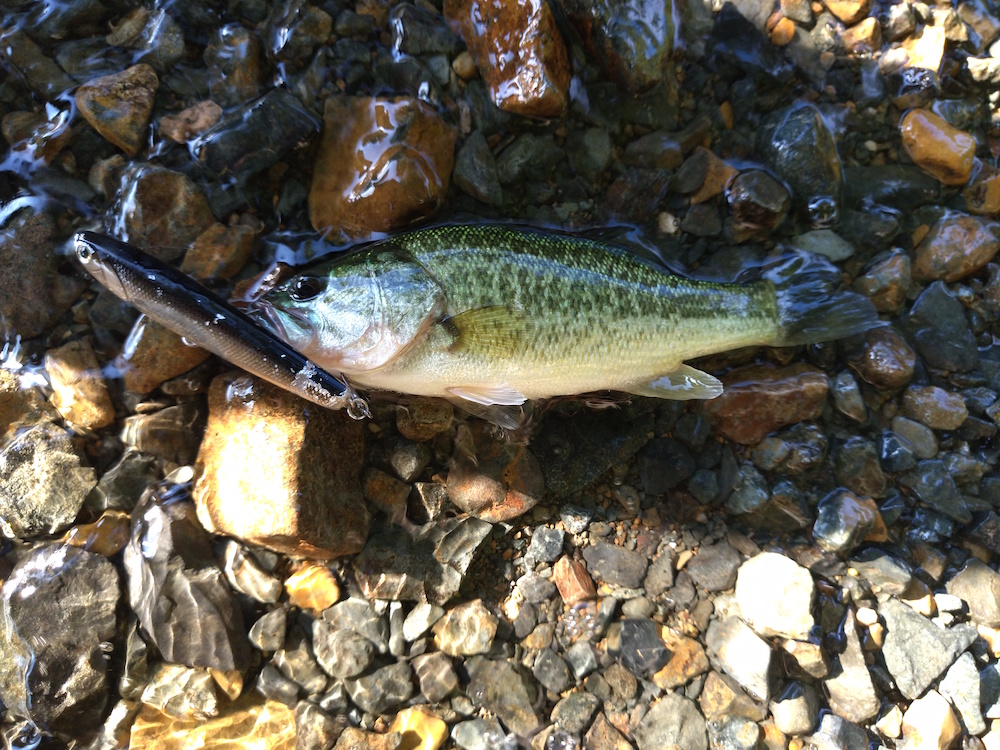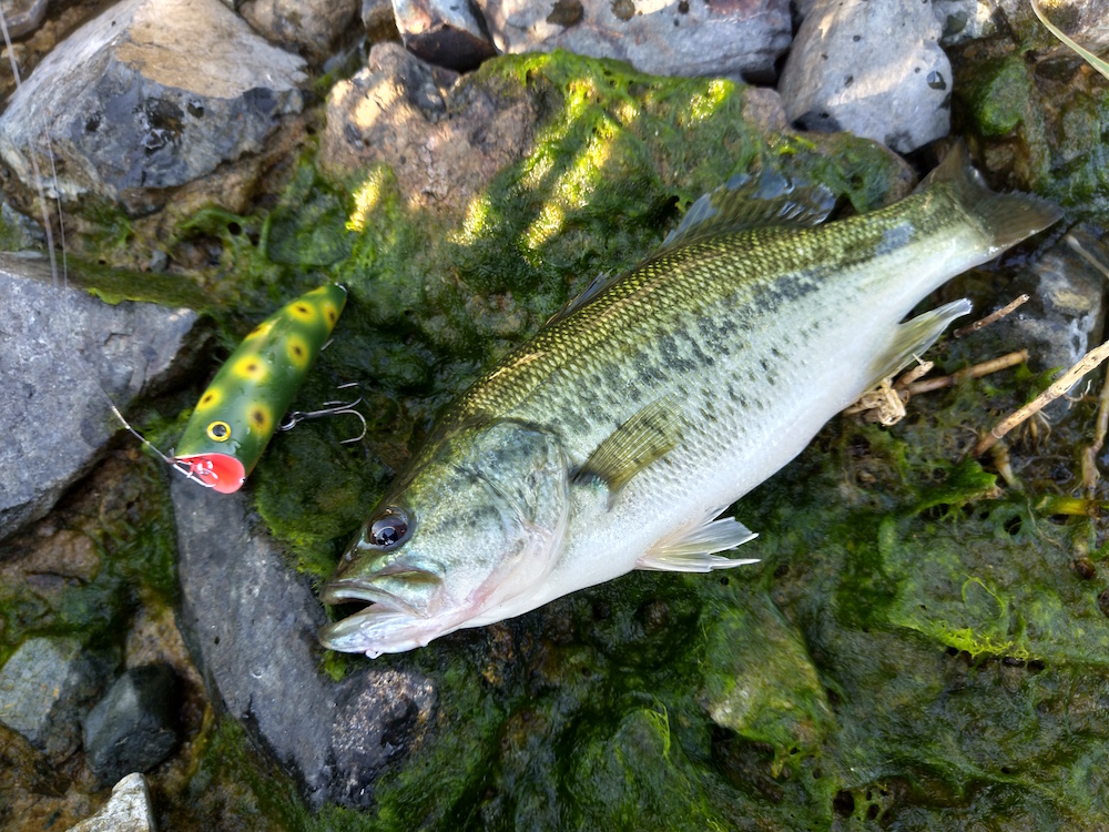 少し強めの北風が湖面を波立たせ雰囲気良好でした。こんな日は、1か所に定位せずに風の当たるところを探してどんどん動いていく方が楽しく釣りができます。この日の3か所目、岬の先端です。これまで入ったポイントで子バスやハスのチェイスは直ぐ足下が多い。やはりこの波風は岸際が狙い目なのは明白です。もちろん地形にもよりますが。向かい風に向かって軽いキャストを繰り返し、急深からなだらかに地形が変化するところで待望の良型がヒットしました。この手の釣りはフラッシュバックが得意とするところで、なんならフラッシュバックにこの釣りを教えてもらったのかもしれません。風のある日を素早くランガンして、浅瀬に来てる食う気まんまんのバスを誘う。ええ魚と出会えました。ちなみに少ししてから風が止み始めたので、タイミングもここしかなかったようです。また、出掛けてみます。