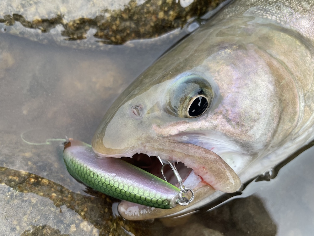 こんにちは。愛知のかばちぃです。関東の釣友と奥飛騨へ釣り合宿に行って来ました。釣り合宿といっても温泉宿に泊まって奥飛騨グルメを堪能しながら、いい時間だけ釣りをするユルーいものです。初日。前日は雨だったので昼から入渓。まだ水位も高く本流はゴンゴンに流れていますが、酷い濁りは無くささ濁りでした。アップの釣りは反応が無いのでクロス~ダウンで探るとかわいいイワナ、ヤマメがポツポツ遊びに来てくれました。2日目は朝イチから。この日もまだ水押しが強いのでダウンクロスで打って行くと幸先良く尺イワナをゲット。その後もアベレージサイズのイワナ、ヤマメを追加して気分良く進んでいたのですが…やらかします。対岸ギリギリに着水した50cwSが反転し、リップが水を掴んだところでリーリング開始。と同時にググッと強い引き。アワセを入れる事も出来ずに綱引き状態になってドラグも出ていく。強い流れの中に魚体が見えた瞬間、パッとミノーを吐き出して悠々と去って行きました。妄想かもしれませんが、鼻の曲がった体高のある大イワナだった気がする。そこからは動揺しまくりでバラシ連発。場所を変えてもバラシ止まらずで再移動。川幅の広い大場所へ。「いかにも大物が居そうなポイント」だけど過去に良いのを釣った事が無い所です。釣友が先行して打ったようなので、数投して移動しようかなぁと軽い気持ちで対岸へロングキャスト。流れに乗せながら軽くアクションを加えるとガツッと強い当たり。先ほどの教訓を生かして追いアワセも入れて慎重に寄せるとデカいイワナ。ハーモニカ食いになっていたので、コレは追いアワセ無しでもバレなかったかな。ちょっと細身でしたが大満足の38cm。先ほどのバラしも忘れさせてくれました。この後はアメマスみたいな斑点のイワナや泣き尺の良いヤマメも追加していい感じだったのですが雨が降ってきたので15時くらいに退渓しました。3日目は雨予報だったのに雨も降らずに水位も低下。おまけに水質もクリアに。一番良さそうな感じがしたのですが良いのは出ず、おチビさんばかりで終了となりました。これだから釣りは難しいですね。今回、クロス~ダウンの釣りがメインだった事もあり、サミング50cwSがハマりまくりでした。正直、他メーカーの渓流用ミノーやハンドメイドミノーも多数投入しましたが、ここぞという所では50cwSが圧倒的に強かったです。RYUTAさんやsaddaさんに話しを伺ってもまだ全然50cwを理解できていませんが、必殺ルアーが増えた事は嬉しいです。さぁ次は琵琶湖へ行こっと。