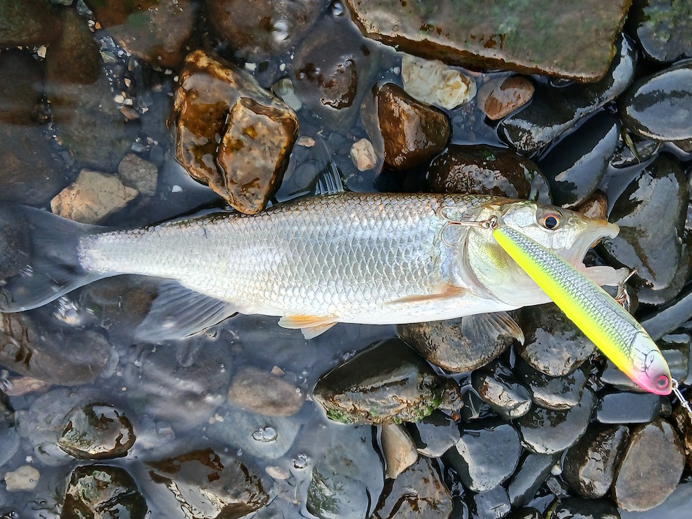 ご無沙汰しております。レポートは半年ぶりくらいでしょうか。「今か今か」とボイルを探して右往左往しております。この時期に欠かせないアユが全体的に少なく、例年よく回ってくるポイントも寂しい状況です。ただ、アユが多いからといって釣れるというわけでもないので、最近はあまり翻弄されすぎないようにしています。今回は天気に恵まれ、北西からのやや強い風が吹いていました。波に揉まれたフラッシュバックを襲ってくれないだろうか。私の大好物な釣り方ではありますが、反応があるのはハスばかり。バスはいるかどうかは分かりませんが、魚はとても活発に動いているようです。レンジを下げてフナミノーにチェンジ。巻きを遅くしてもタイトにキビキビ動くのでアピールするにはもってこいです。すると、なんと、すぐにバイト。着水から5巻き目くらいの遠い場所でのバイトだったので、「ニゴイじゃないな」と思った次の瞬間、大迫力のエラ洗い。釣れてる時なら、これぞバスと楽しめるのですが、半年ぶりとなると腰が引けてしまいます。何度もエラ洗いを繰り返されましたが、何とかランディング成功。サイズは思ったほどではありませんでしたが、いい魚に出会えました。