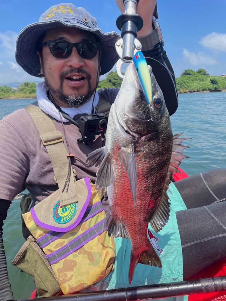 今シーズンは何度かチヌ狙いで釣行してますが、いずれも不完全燃焼でまだやってます!今回は東邦産業(サブロック)の川島氏のカヤックに乗せてもらってのチヌトップです。真夏なので早朝からお昼までの計画で行ってみようとのプラン。風も水色も良く開始早々からお互いにバイトを得るも、ヒットした魚は全てバラす・・・サムポッパーに目の前で食らいついた良型にはブチ切られてルアーをさらわれるアクシデントも。日が高くなり始めて下げ潮のタイミングでもバイトは有るものの掛からない・・・チェイスする個体を見ると、どうもサイズが小さい。ならばとダイヴィングサム55CWを投入すると直ぐに小さめを一枚キャッチ。只、ライトトリップ55Lとはタックルバランスが悪くて扱いづらい。特にキャストが決まらずにもどかしい。ポイントを移動してフランクサム&サムポッパーで押し通す二人。何度もバイトが有るも掛からずにノーフィッシュだった川島氏も遂に40㎝クラスをキャッチ。カラーはまだ誰も釣っていなかった、と言うか使っていなかったブルーヘッドシャッドCL。僕のお気に入りのカラーで釣ってくれた川島氏は頼りになります!その後もお互いにチェイスとバイトが多々あるも、川島氏がフランクサムのマットクリアースカルで2枚をキャッチしてくれたのみ。僕の方は1枚目以降10数バイト程あったもののフッキングに至ったのは2尾位か・・・それも全てバラすとは・・・真夏の不完全燃焼は続きます。