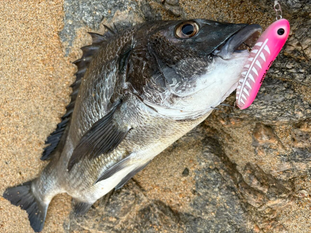 今朝夜明け頃は夏場ではあまりない干潮のタイミングで、経験上チヌトップには条件はよいはずです。干潮でシモリが露出している脇を通していきます。シモリ横に着水したフランクサムの周りにふわっと波紋が出たので、しばらく様子を見て引き込んだのを確認してフッキング。44センチですが、ようやく今月初の黒いチヌでした。暑さもピークを過ぎるともっと反応してくると思いますが、この異常気象では、まだまだ厳しいとも思います。