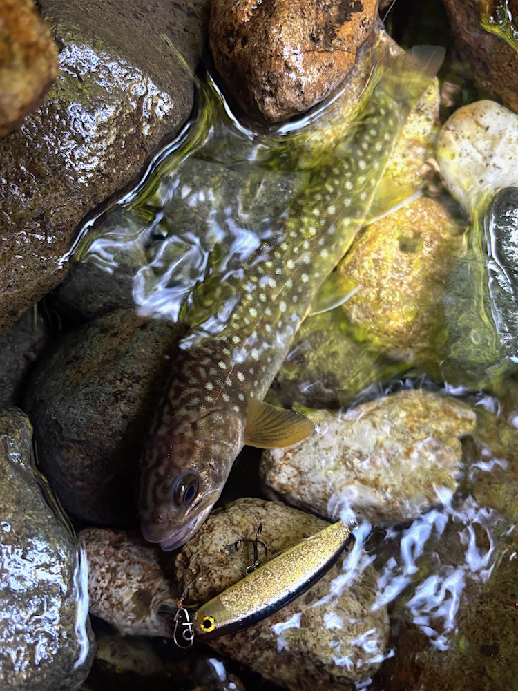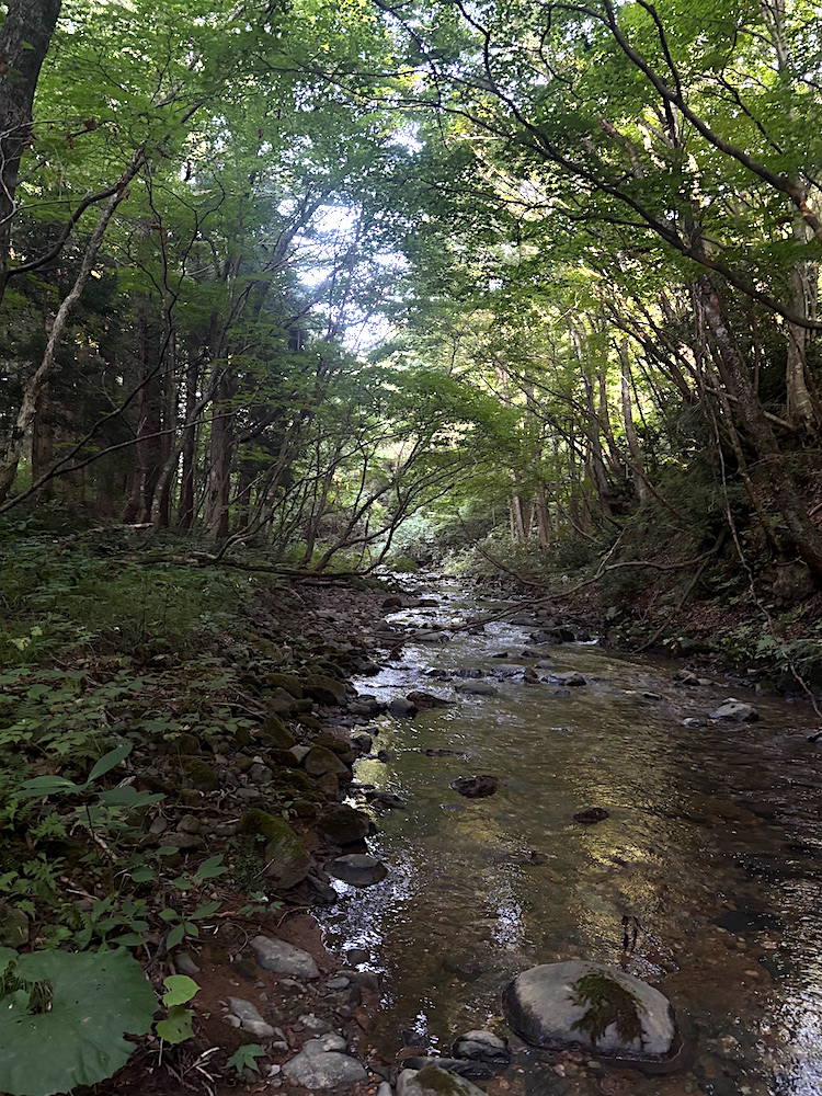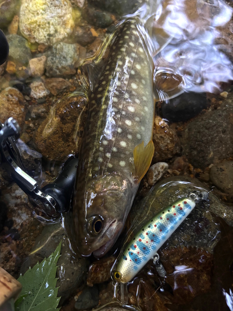 サムさん、社員Aさんこんにちは。今年も本州ほぼ最北端の渓に行って来ました。台風15号が西日本横断しており飛行機飛ぶかどうかヤキモキしましたが無事に出発。翌日、釣場に到着するも川に水がほとんどない。あれ〜この辺も先週ぐらいに線状降水帯発生してたはずなのになぁと思いながらとりあえず釣り開始。少しでも水のある所を釣っていけば爆釣かと思いましたがそんな甘くなかったです。追いもほとんどなく指サイズがジャレついてくるぐらい。お昼過ぎまでやって4匹でしたが何とかイワナの顔が見れて良かったです。