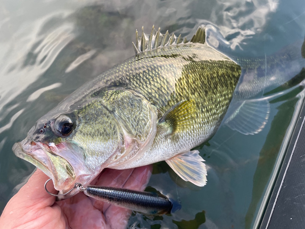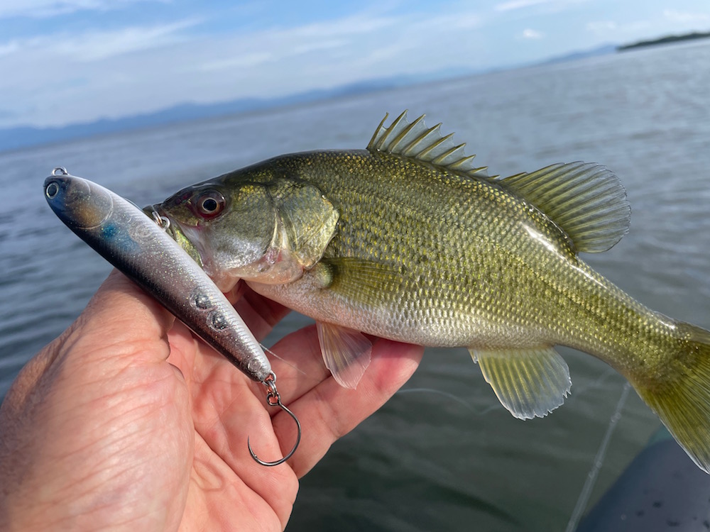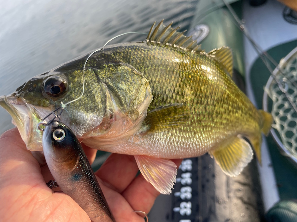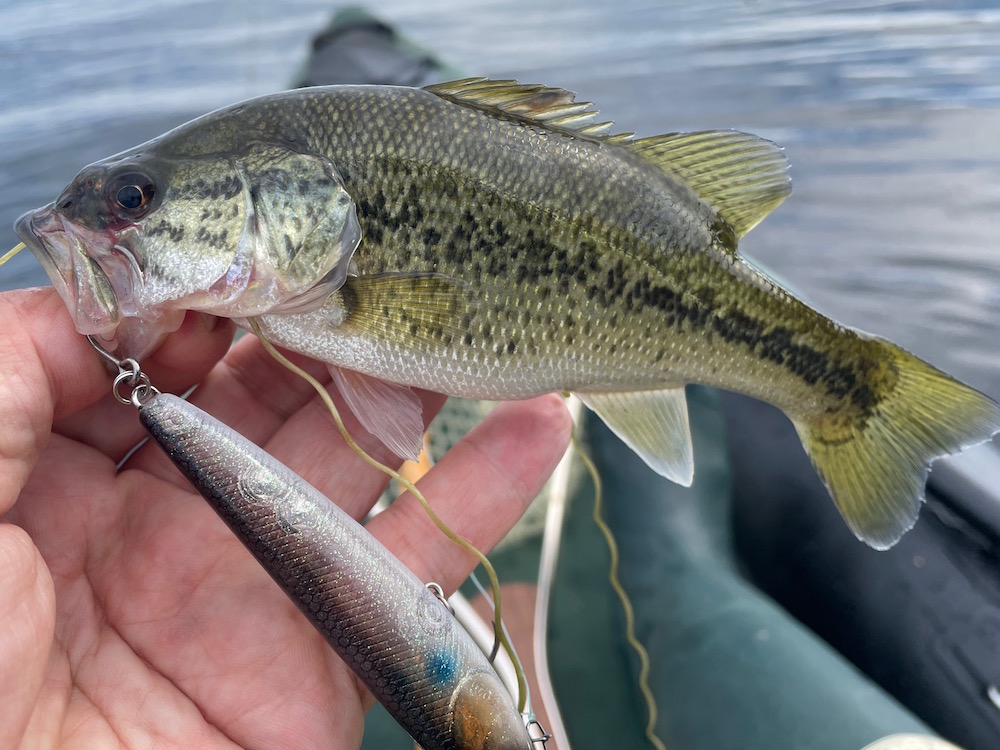 今年もカヤックを浮かべている場所にはウィードが多い。魚影以上にウィードが多い。そしてウィードがあってもそれに纏わる生物が少ない。やはり冬から初夏に掛けてウィードが枯れる影響が大きい気がします。それでも陸から大物を釣ってくれてるユーザーさんもいる訳でチャンスは有るはず。オフショアのアドバンテージを生かさねば!と意気込むもここ二回は返り討ちにあっております。小バスが釣れてくれますが、ほぼ陸からの釣果と変わりなし、難しいもんです。でも諦めません、釣れなくとも!で、今回は文字数としてもレポートとしてちょっと足らないので、シングルフックについて。この時期はウィードを回避する為にシングルフックを多用しますが、その効果はかなり高く、間違い無く釣果に繋がります。只、そのメリットの反面にルアーによっては動きがデフォルトに比べて不十分に感じる事も。そして、ヒットした後にウィードに絡んで藻化けも多い印象です。釣りが成立するのとの引き替えのデメリットはご了承ください。あと、ウィードエリアを狙う上で適度なサイズ感はファットサムジュニアクラスがお勧めです。キャストの正確性&安定感が良好な上に小バスの食い付きも良い。飛距離で言えばフランクサムが優秀ですが、ボリュームはバイト数に影響が出る様に感じます。逆にサイズダウンしてダイヴィングサム55あたりだと、バイト数&ヒット率は増えますが、正確なキャストが難しくなる上に、大型が来た際にキャッチに至る可能性は低くなる事が予想されます。これらは僕の経験上の見解なのであくまでも参考に、フックの取付け向きだけは間違わない様にして下さい!
