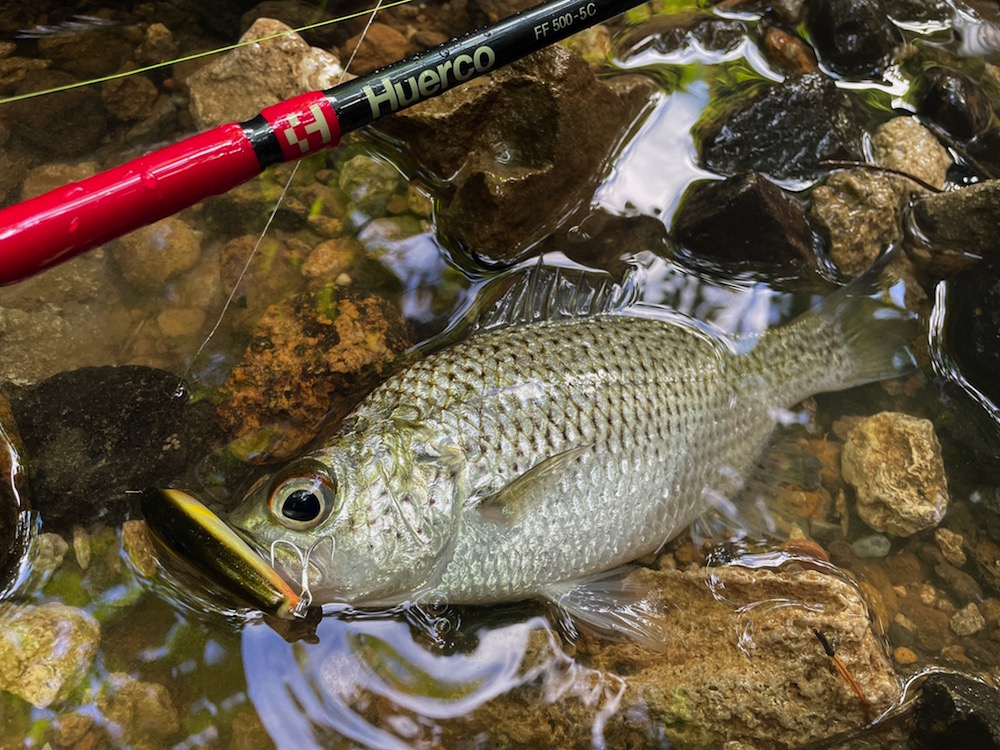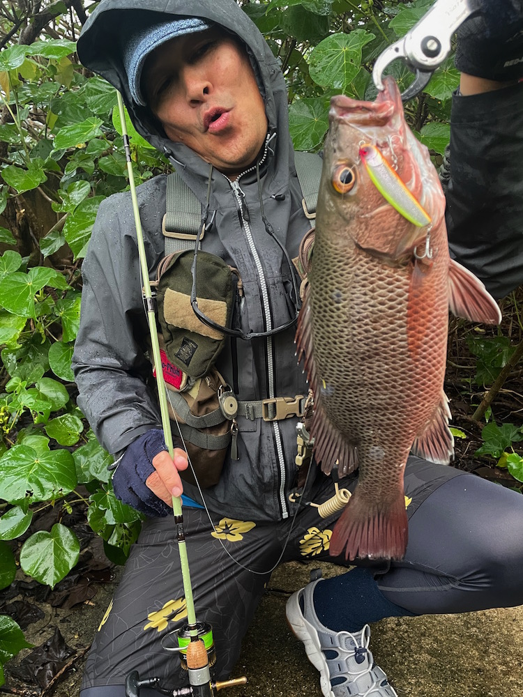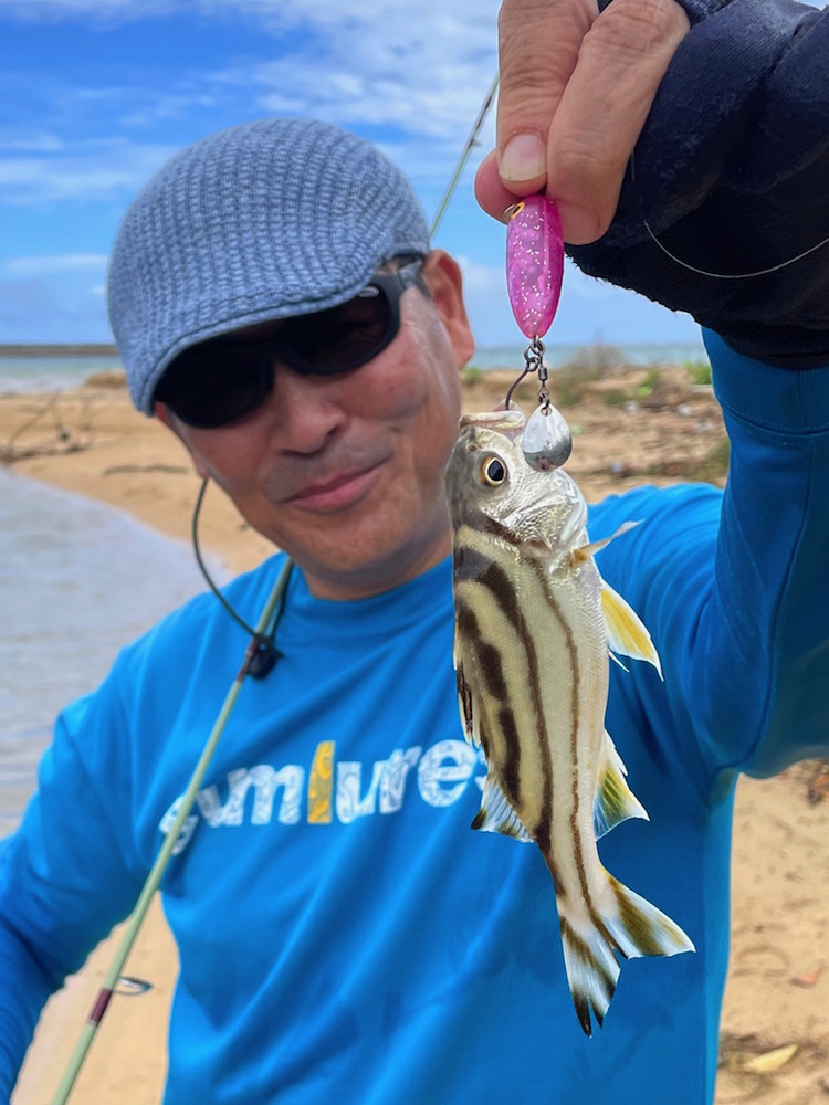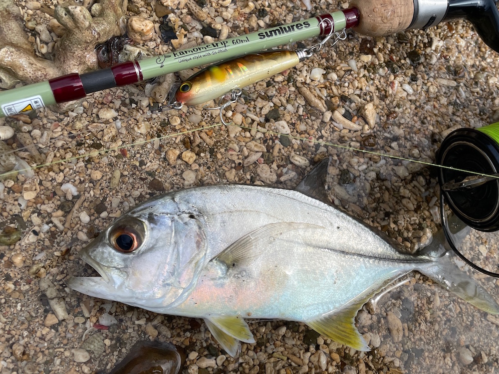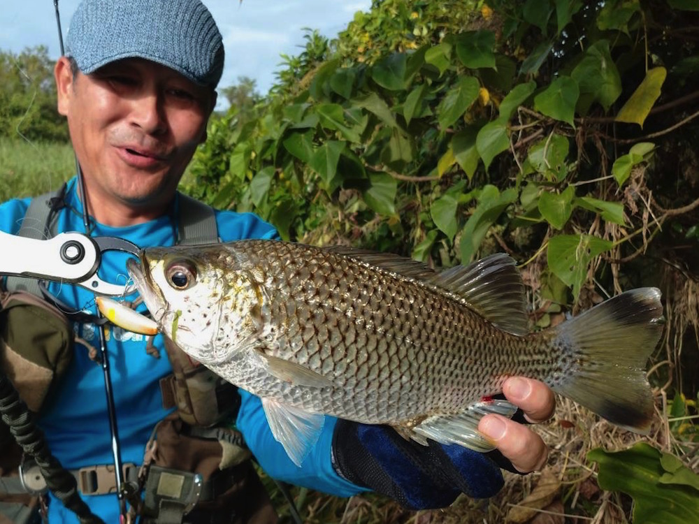 さて、記憶が薄まる前に石垣島レポートを3回に分けて書き留めます。2年前に西表島に釣行した際には経由地として石垣島に上陸しましたが、その時点での印象は街が都会的で釣り場も本島と同様に釣り辛いんだろうと想像。しかしながら、石垣島在住のrise氏はかなりコンスタントに釣果を送ってくれます。よくよくマップで島を調べると、意外に本島や西表島よりポイントに入りやすい印象です。それに加えて今回は心強い地元ガイドrise氏の存在、これはもう間違い無いでしょう。早速釣行1日目についてですが、天気は例年に無いくらいに雨続きだそうで、何となく気持ちも重くなりがちですが、釣りについてはグッドコンディションです。午前5時半に宿を出発してスタートフィッシングは6時半頃だったか。いきなり本命(ポイントも魚も)狙いです。只、この日の条件はどうもマイナス要素が多い様で・・・ウィーディングしてのピンポイントはノーフィッシュ。釣りには付き物の結果ですが、近くにあるサブポイント案内してもらい待望のファーストフィッシュとご対面!そう、念願のゴマフエダイをキャッチ!サイズもそこそこの35㎝位か。足場が高かったのでサミング70SPに襲いかかった瞬間も目視出来て、ハイテンションになりますねぇ。このゴマフエダイが最も釣りたかった魚種でもありますから尚更です。ちょっとバスにも似た体型ですが、アタリも激しくファーストランは主導権を奪われました。そして、少し余韻に浸りながら次のポイントへ移動、そのターゲットはオオクチユゴイとの事です。渓流にも似たポイントで釣ると聞くこの魚ですが、確かにそこはジャングルに流れる小川。只、魚が付くポイントはどちらかというと溜まりや大場所の様に感じます。魚は非常に好奇心旺盛というかハングリーで居れば直ぐに反応。ポイントには個体数がそこそこ確認出来るので生存競争は厳しいんでしょう。今回は渓流タックルを用意してなかったのでかなりキャストに手こずりましたが、先ずはキャッチ成功、ルアーはダイヴィングサム55cwとサミング50cwです。途中に何ヶ所かポイントを巡り、メッキやコトヒキを釣りつつ良型オオクチユゴイが生息するポイントへと。先ずはサムポッパーで狙いますが不発。ならばと頼りになるはサミング50cw。流れにアップで送り込み巻きながらトゥイッチを入れるとドスンと重たいアタリ!水中でもだえる銀色の魚体は間違い無く良型オオクチユゴイ。このクラス(30cmを超える)になると引きも強くウェイトがあるので少し強いロッドが安心です。追加の一尾をサミング70でキャッチした後、再度早朝の本命ポイントに挑みます。条件は早朝よりも上向いており期待も高まりますが、自分にはどう足掻いても魚信を得られず。同じポイントをrise氏に試してもらったところ、あら不思議のゴマフエキャッチ!A級ポイントであってもコースやスピード等に微妙&絶妙なコントロールが必要だと実感しました。という事で初日はかなり満足な結果で幕を下ろします。rise氏有難う御座いました。