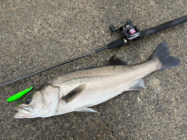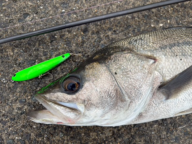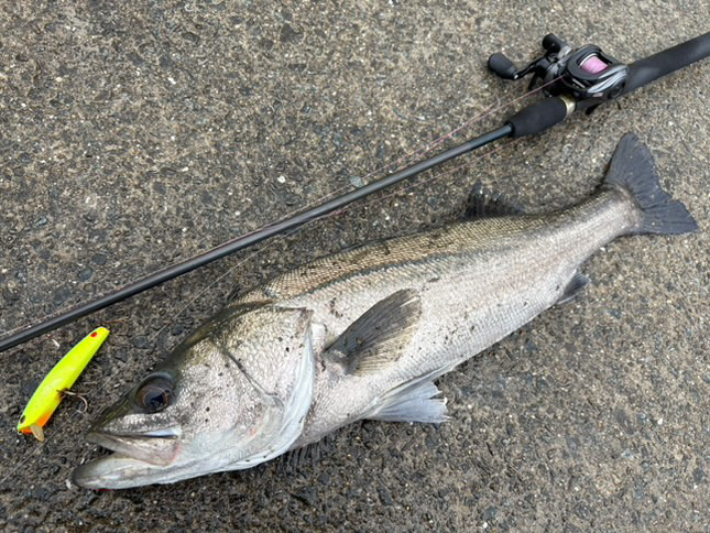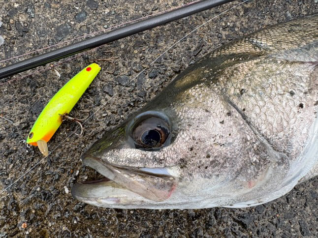 明け方からの雨がようやく止んだ午後、干潮周りとはいえ潮位が高いので河川に行ってみました。コトカスミディアムを選択して壁際を通してみます。ショックリーダーの結び目が見えて濁りの中からコトカスミディアムの背中が見えたタイミングで真下から猛然と飛びかかってきました。まず66センチ。もう一度通しましたが、壁際は反応なし。ファットサムGPに交換して流れのヨレている部分を通過するように通してみると、水面が爆発して重々しく頭を振りながら抵抗してきます。今度は状態のすこぶるいい71センチ。サムルアーズ3キャストで2尾。釣れる時はこんなものですね。