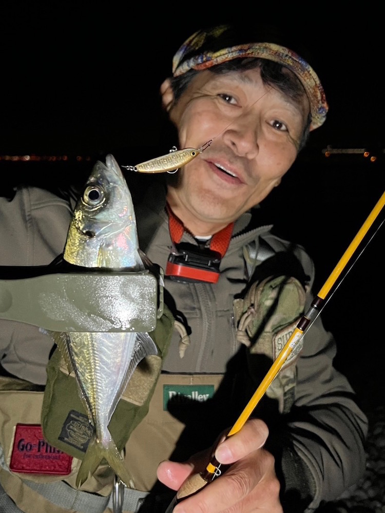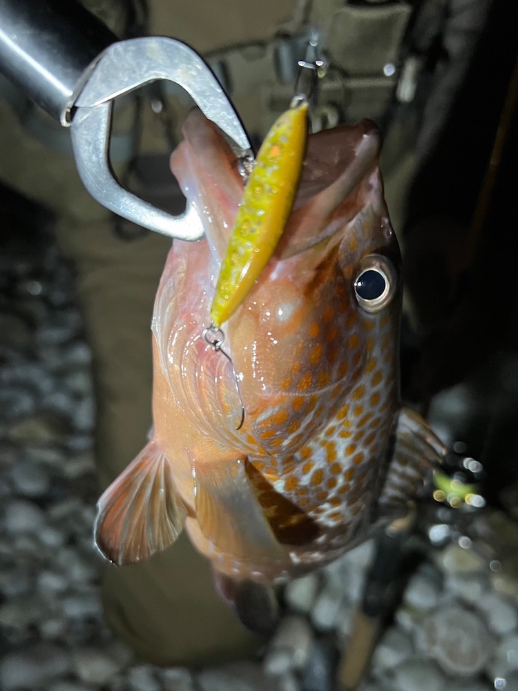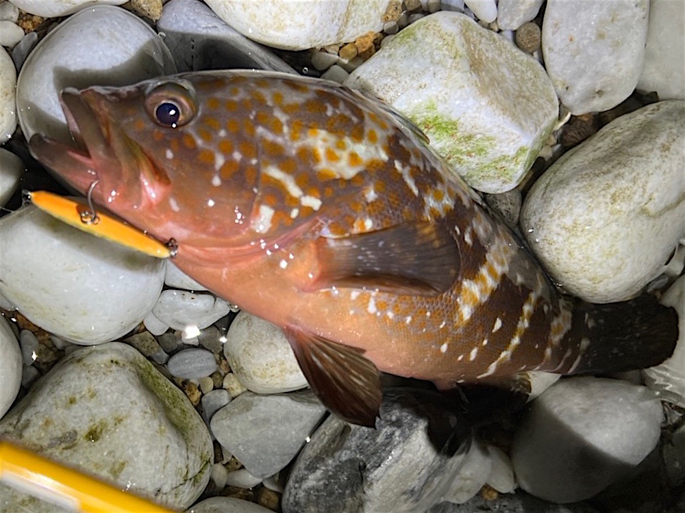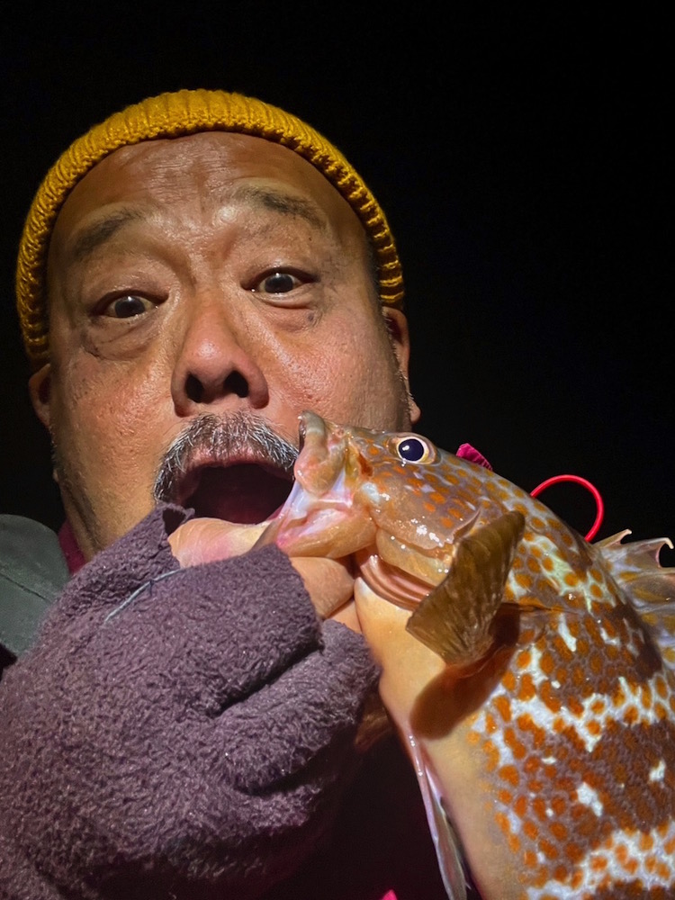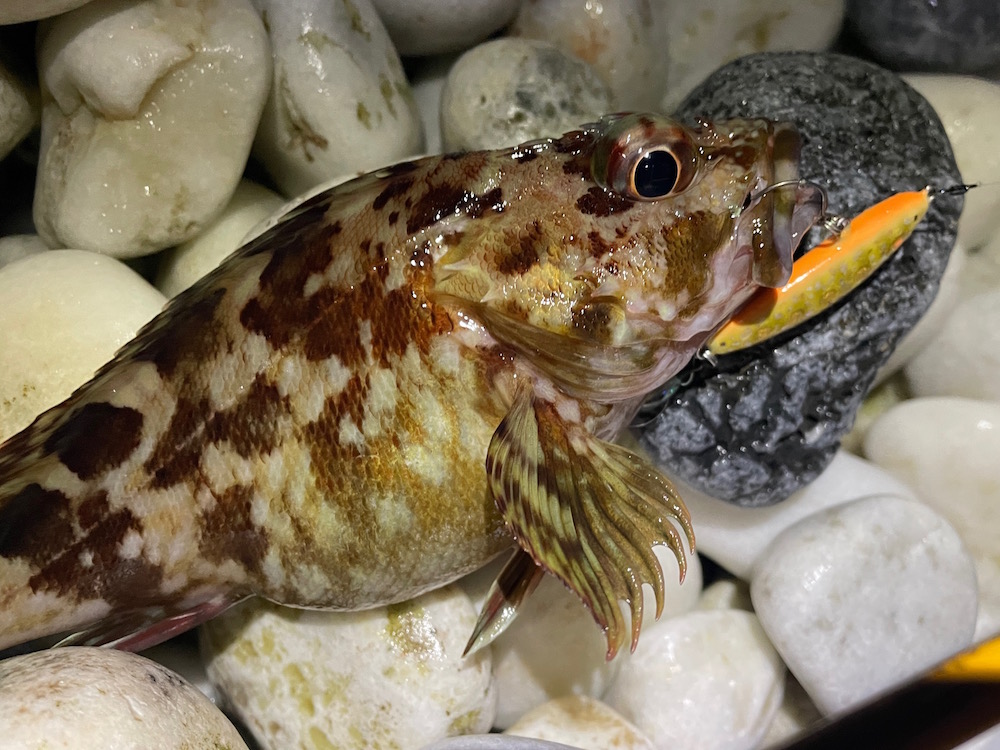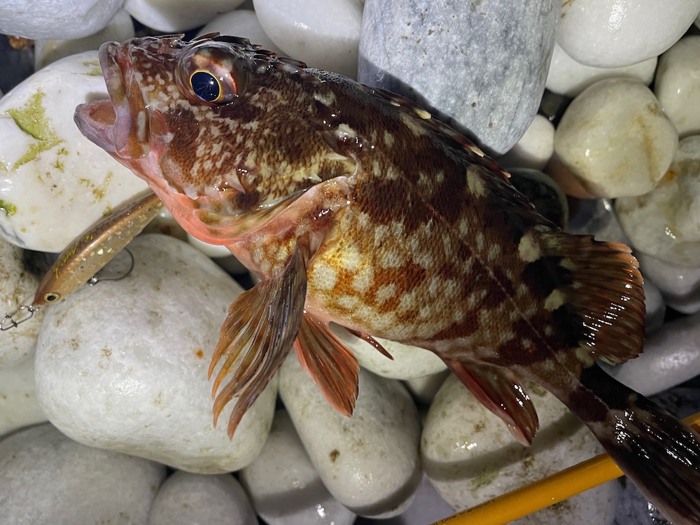 SNSでは簡単に釣果を公開しましたが、改めまして。毎度の事ですが、ゴーフィッシュ武田さんとの打ち合わせ後は決まって何かを釣りに案内してもらいます。この日は波風があればスズキ釣り、穏やかならメバルガシラ狙いってプランだったのですが、この日は小春日和の暖かな無風〜微風。言わずもがなの五目釣りに決定です。ポイントは過去に一度、武田さんに連れて行ってもらった場所ですが、その時は僕のプラッギングが全く通用しなかった記憶があるな。さて、今回はどうか、手持ちのアイテムは増えてます。期待の筆頭アイテムはプロップドロップミニ。到着して早々にプロップドロップミニを結び、底まで落として(恐る恐る)巻き始める。陽がとっぷり落ちてからの開始30分程は全くの無反応。やはりハードプラグは厳しいのか・・・キープキャストを繰り返していると明らかな魚信!フッキングに至らなかったものの、可能性あるな!と。プロップドロップミニをかなり投げ続けていたので、ここらで奥の手SJ4を投入。正確には奥の手ではない。実際のところSJ4ではトラウト以外釣った事が無いのだ。でも、ローテーションするとしたら、今はこれしか選択肢が無い。ハンドメイドだけにこれまで以上に緊張する。投入する事数投。待望のヒット!カモメトレイル56ULが大きくしなる。時折岩に裏に隠れるのか動かなくなるが、緩めておくと動き出す。じっくり寄せてズリ上げると。これはこれは立派なアコウ!嬉しい!初めて釣りました。良い肉付きで重く綺麗な柄です。この一尾で大満足、しかもSJ4。ちょっとしたラッキーパンチ何だろうと最初は思ってましたが、その後、立て続けに反応があるある。勿論、武田さんも着々と釣り上げますが、やたらと反応が有るSJ4には武田さんもビックリ“それなんですの?”。ああ、これはオヤジのジグですわ、と言うと“オヤジグ!”と爆笑。それからもガシラやアジまで釣れて、ポイント移動したらまたヒット。SJ4の実力を確信した釣行でした。武田さん有難う御座いました!もう既に行きたい、今度はメバル狙いで!