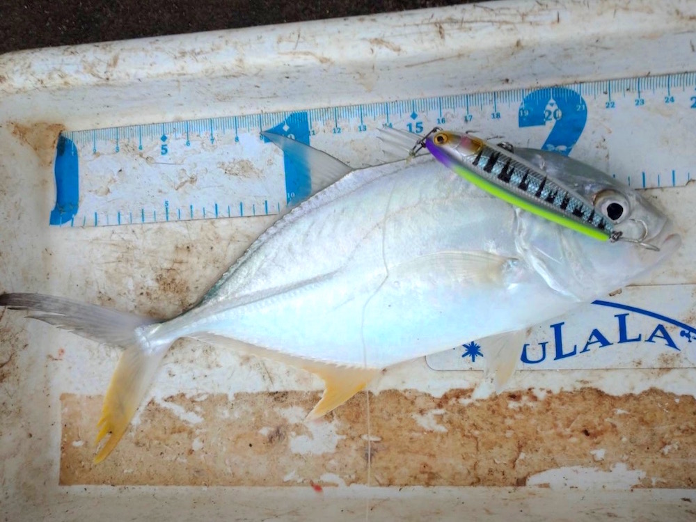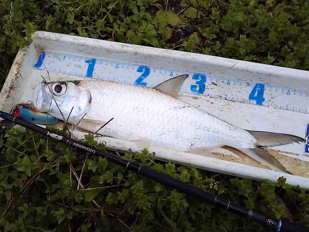 早朝からターポン狙いに行ってきました。薄暗いうちにいきなりサムポッパーにバイトがあり、がっちりフッキングさせブッコぬき。気を良くしてそのままサムポッパーを投げ続けますが、ノーバイト・・・ヤバい時合いが終わると思い、信頼と実績のFB65にチェンジするもとき既に遅し。ターポン時合い終了で、その後はオニヒラメッキが1匹だけ遊んでくれました。