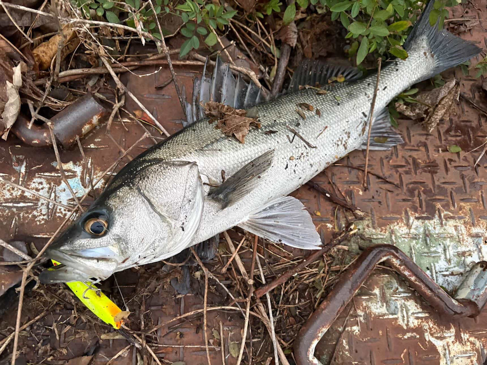 昨日は11月以来の本降りの雨でした。本当は昨夜の雨が止んだ直後を狙いたかったのですが時間が合わず、今朝出勤途上の河川で少しだけ竿を出してみました。まだ濁りは効いていたので、コトカスミディアムの派手な色を選択。久しぶりなので一投目は狙うコースを外して感触を確認。次のキャストで狙います。コトカスミディアムが一番深く潜った辺りで魚が乗ってきました。大したサイズではないので抜きあげました。たぶん50センチ半ば。まだ餌を食べてないからか痩せていました。この冬は餌がなく、降雨でやっと餌にありつけると川に入ってきて釣られてしまった、ということでしょう。